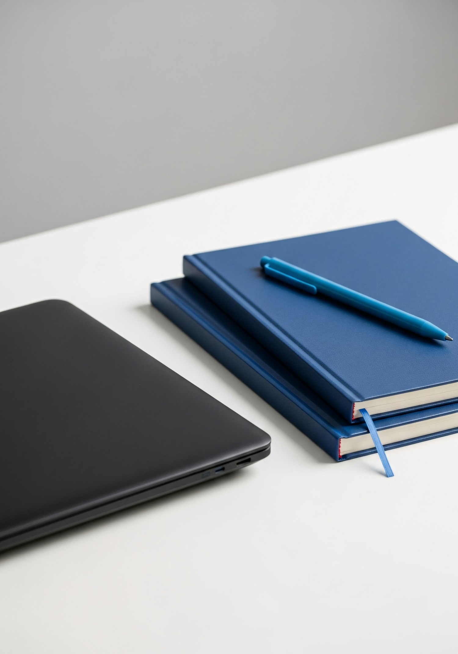 A clean workspace with a black laptop, blue notebooks, and a pen on a white desk, perfect for productivity and organization.