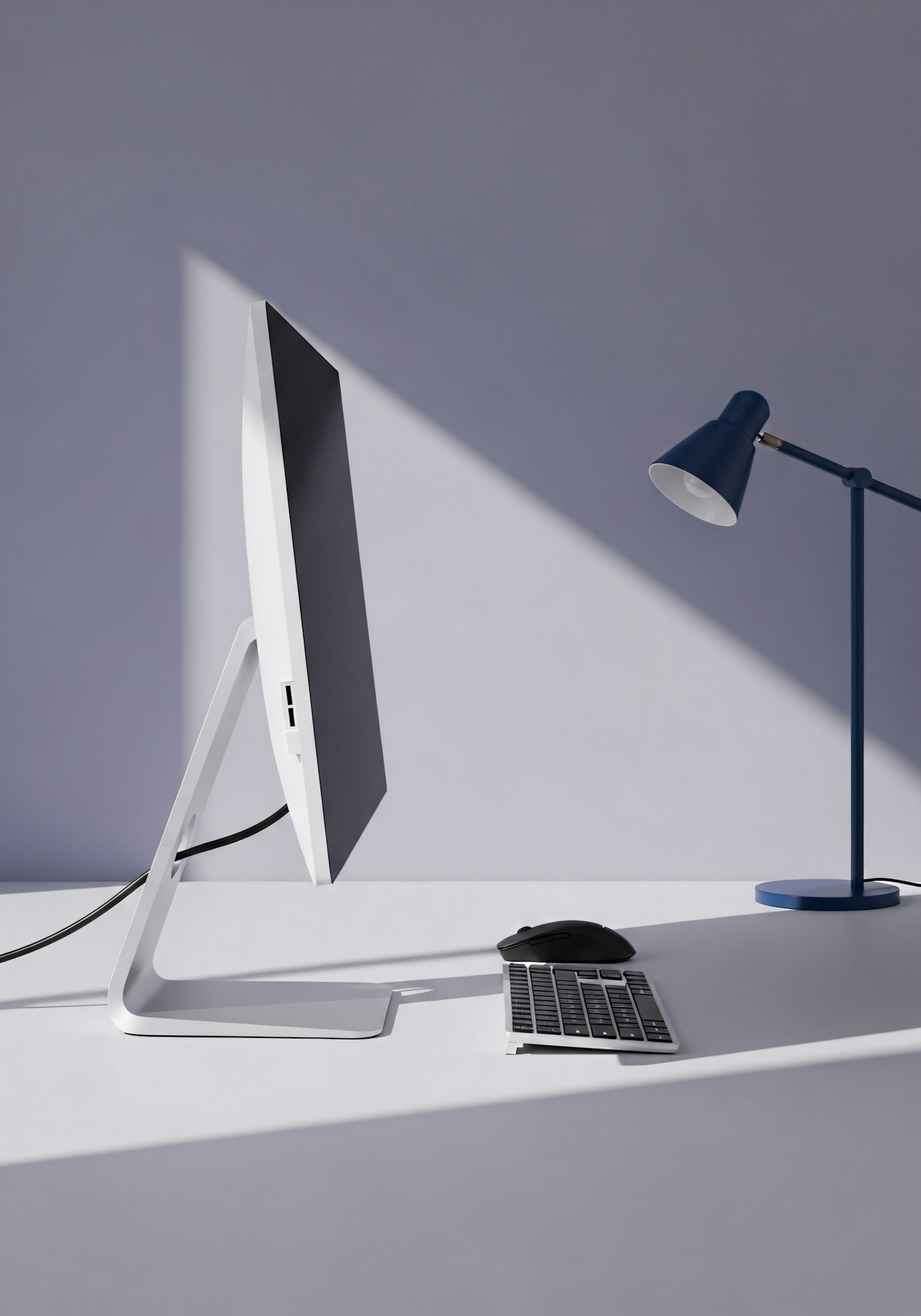 Minimalist workspace with a sleek monitor, keyboard, mouse, and a stylish blue desk lamp on a white desk.
