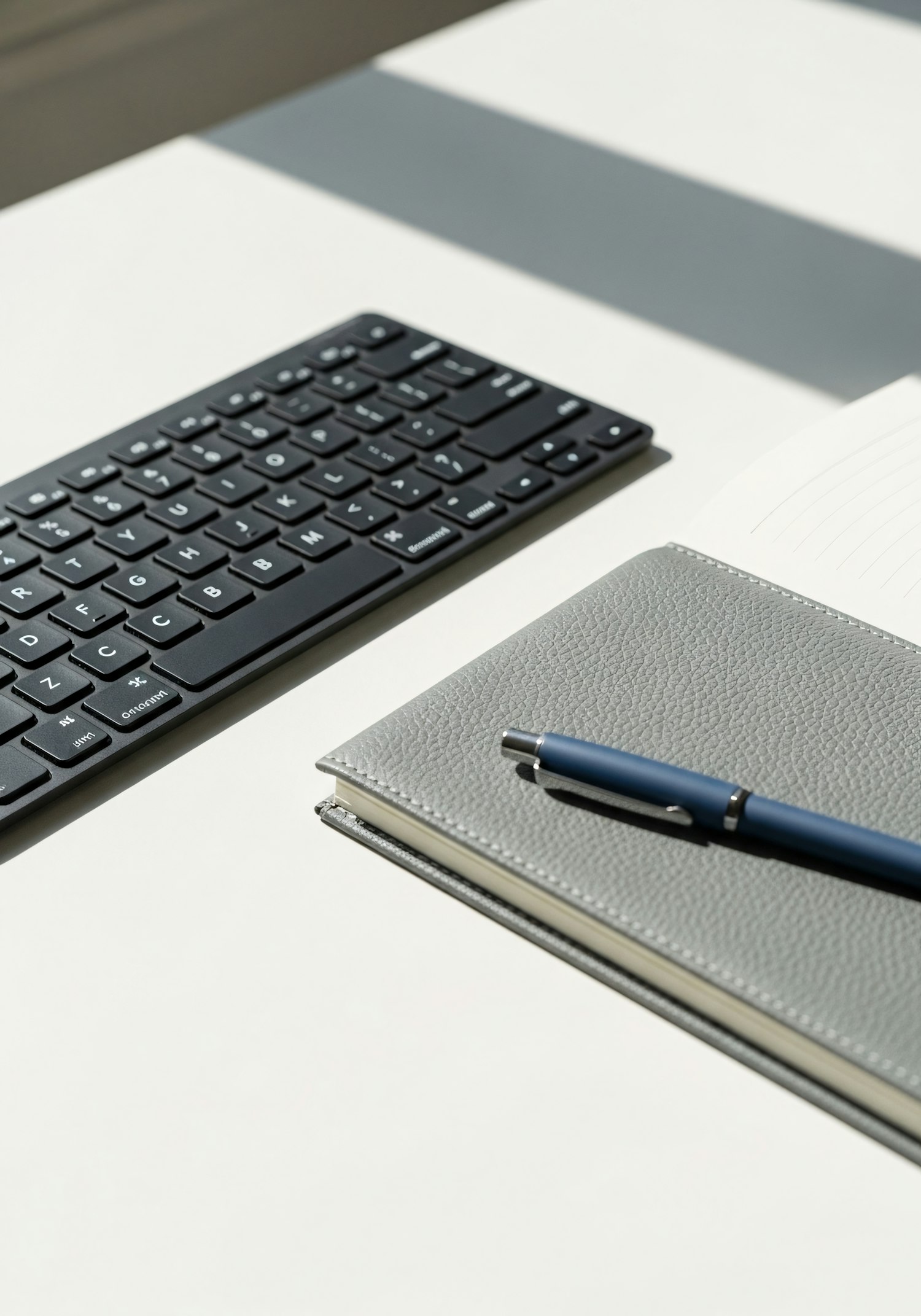Minimalist workspace with a black keyboard, gray notebook, and blue pen on a white desk, bathed in soft natural light.