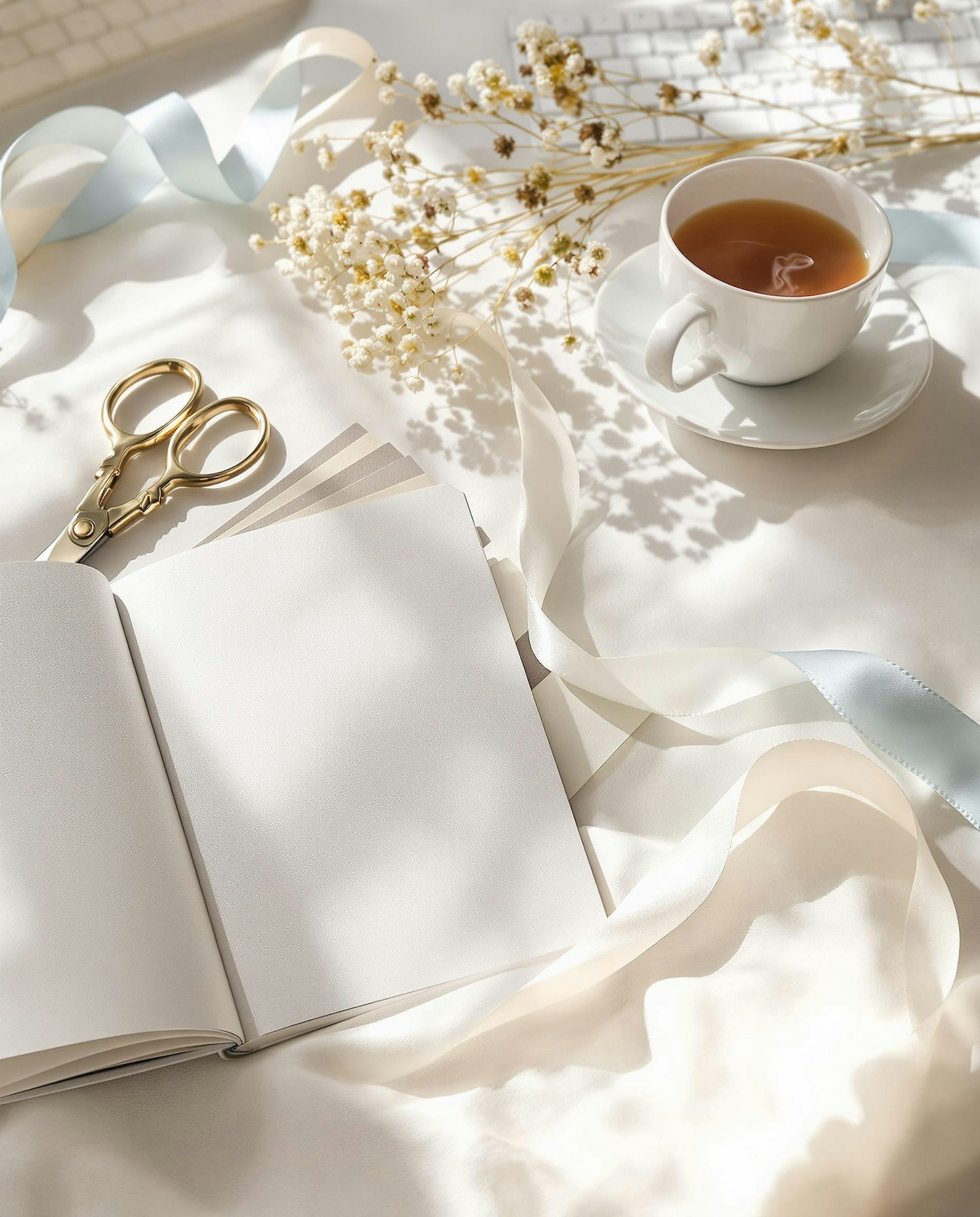 Soft natural light studio photo of a feminine creative workspace with a linen notebook, vintage scissors, textured paper samples, a ceramic cup of tea, a white wireless keyboard and dried flowers. A soft blue-toned element subtly integrated into the scene, like a ribbon or a ceramic object. Calm, elegant and airy mood, warm shadows, shallow depth of field