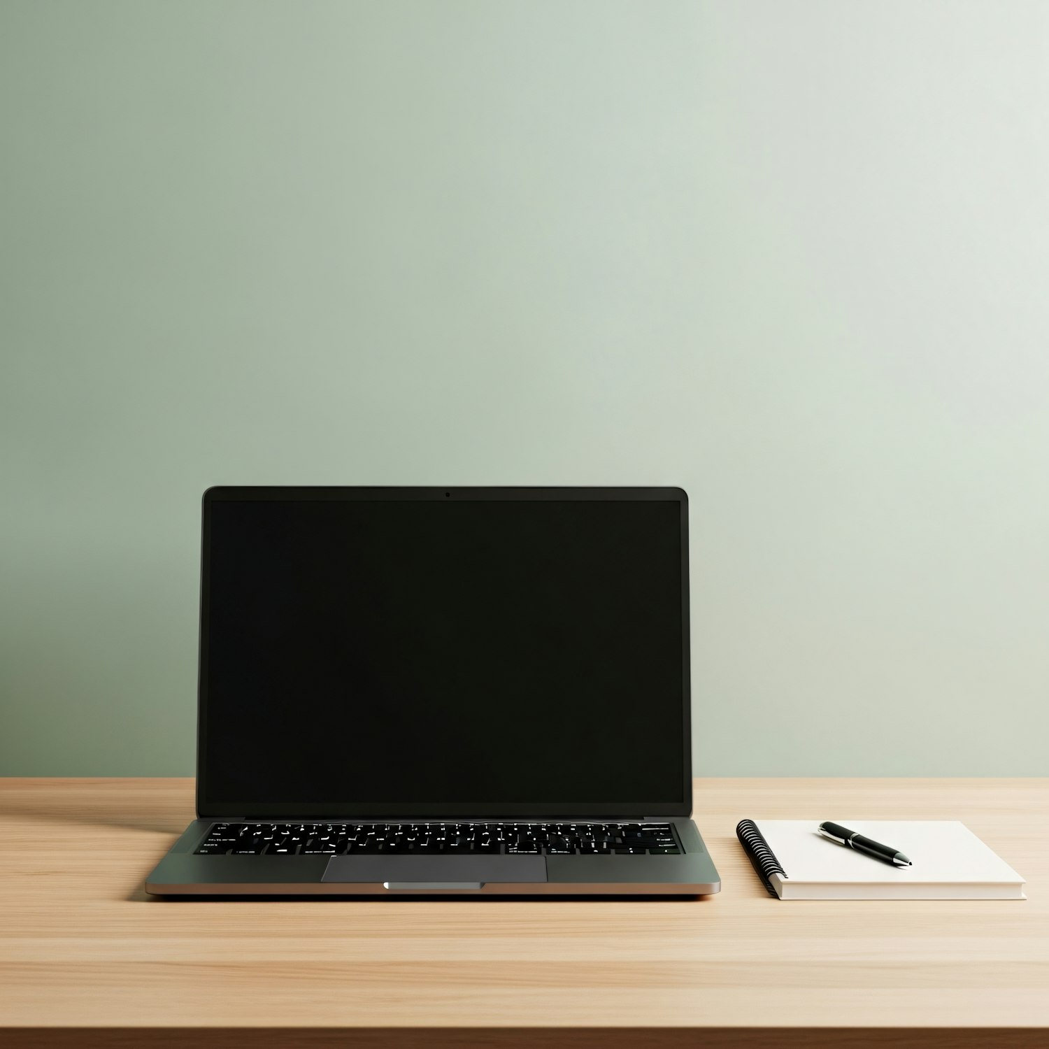 Minimalist workspace with a laptop, notebook, and pen on a wooden desk against a soft green background.