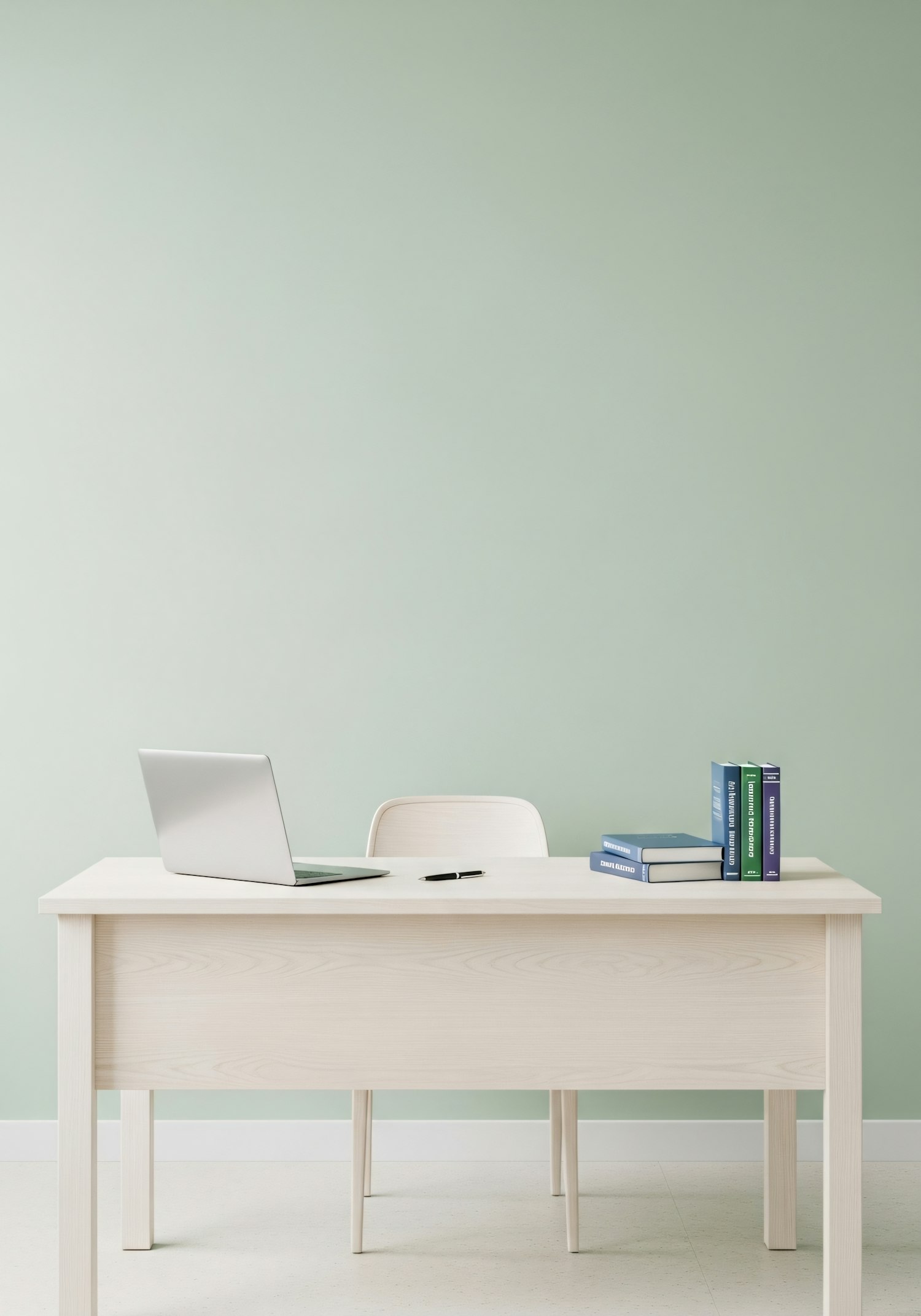 Minimalist workspace with a light wooden desk, a silver laptop, books, and a pastel green wall, creating a clean and serene atmosphere.