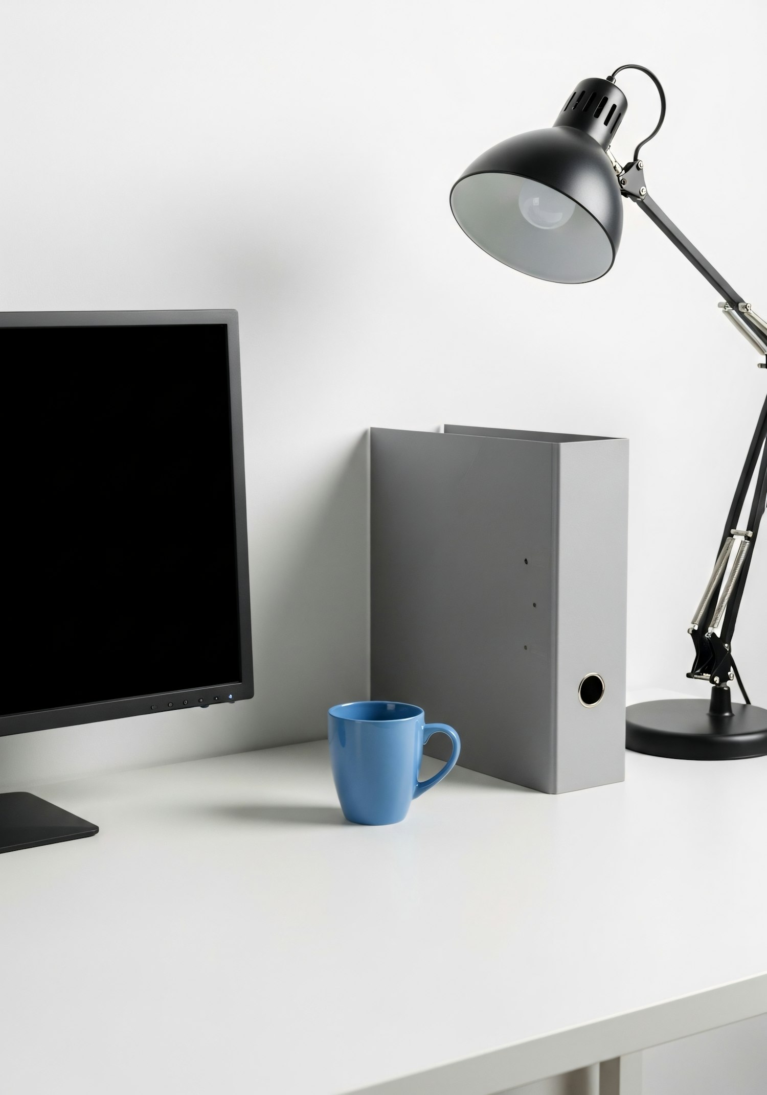 Minimalist workspace with a black monitor, blue mug, gray file organizer, and black desk lamp on a white desk.