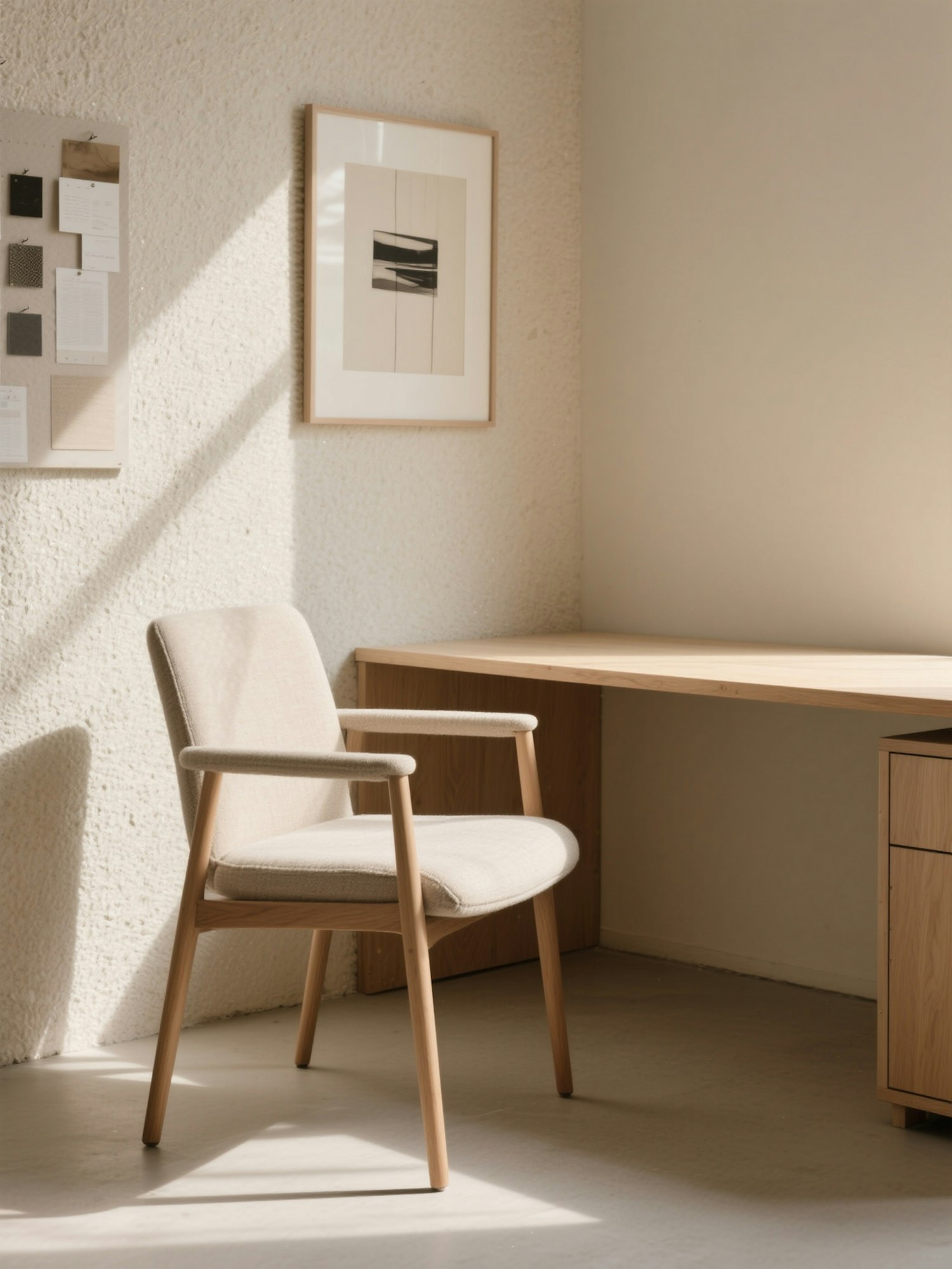 Soft daylight photo, minimal elegant office corner in warm neutral tones (beige, cream, soft wood), viewed in slight angle (not top-down), modern chair with linen fabric, part of a light wooden desk, delicate shadows, textured wall, framed art or moodboard partially visible, clean and peaceful atmosphere, high-end editorial style, soft focus, natural light