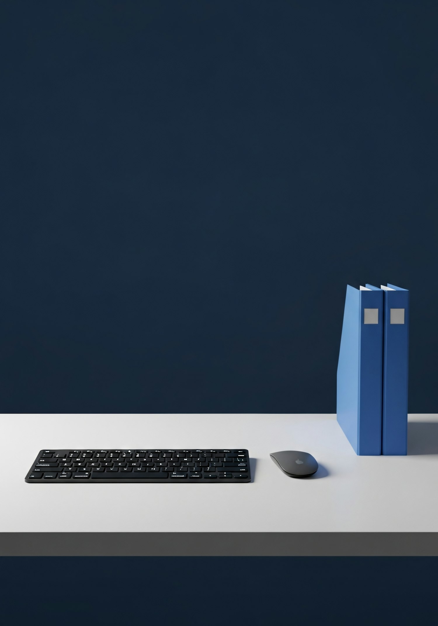 Minimalist workspace with a black keyboard, wireless mouse, and blue file binders on a white desk against a dark blue background.