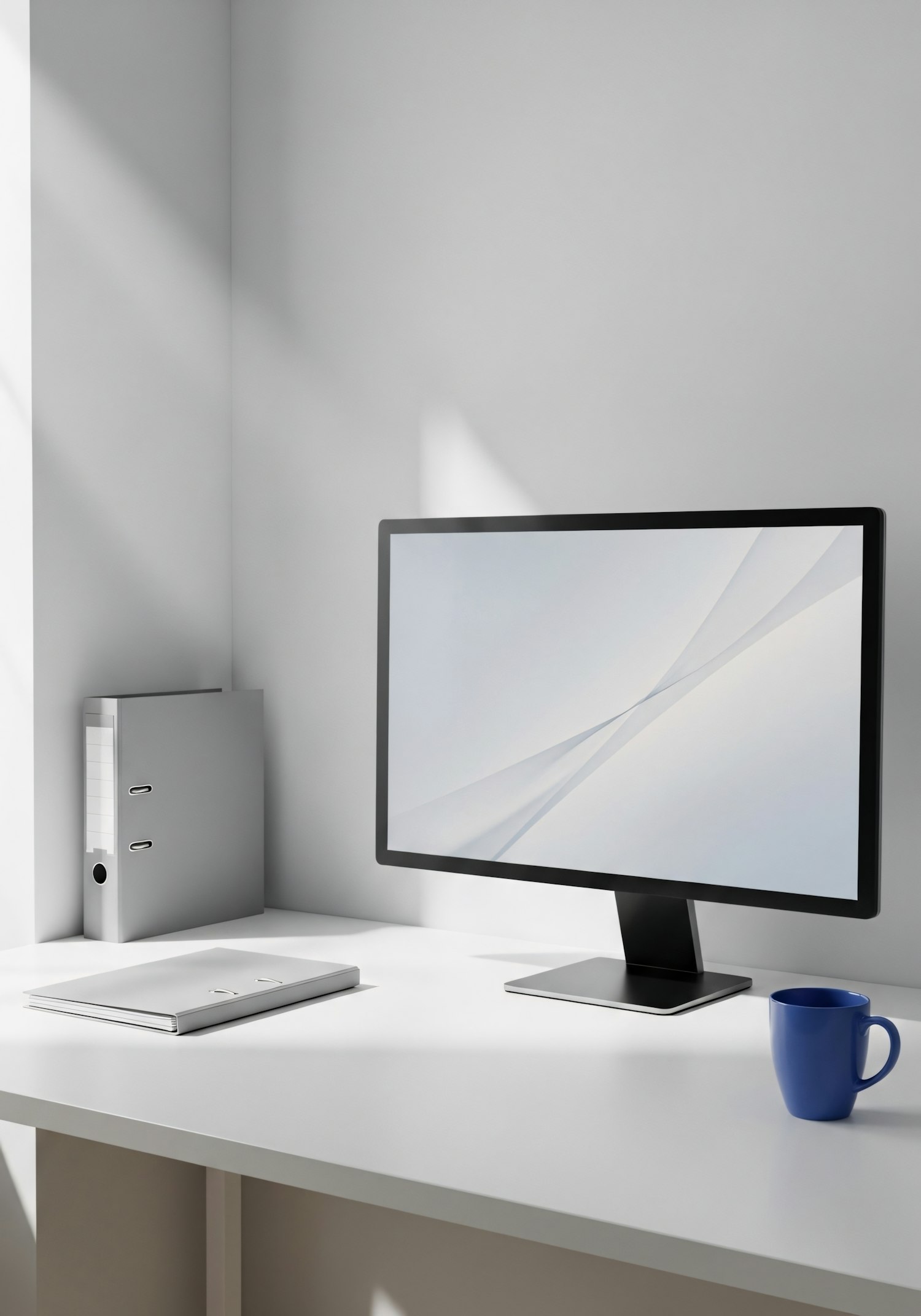 Minimalist workspace with a black monitor, silver binder, and blue mug on a white desk, bathed in soft natural light.
