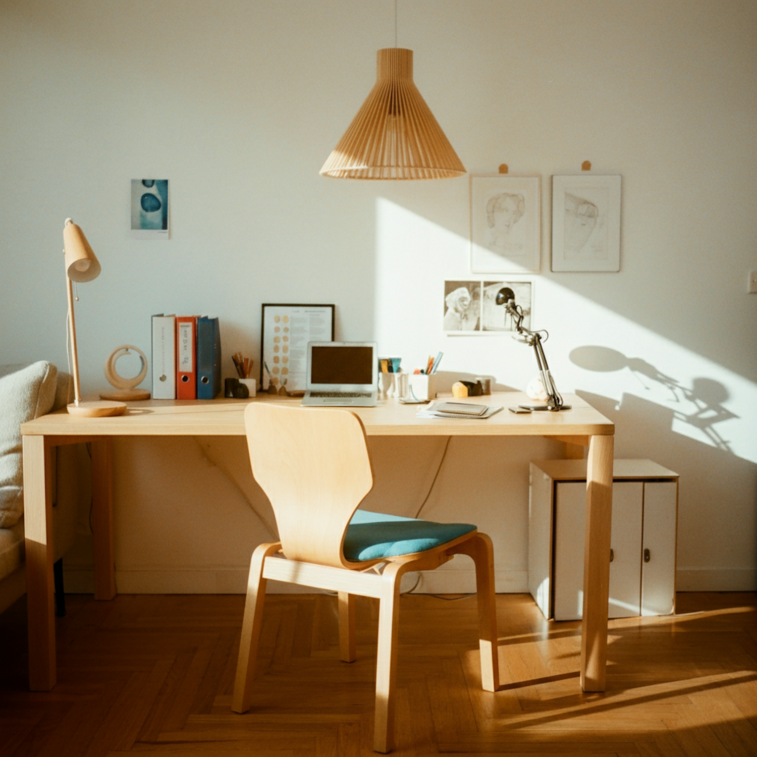 Minimalist workspace with wooden desk, chair, and pendant light. Sunlit room with laptop, art prints, and organized stationery.