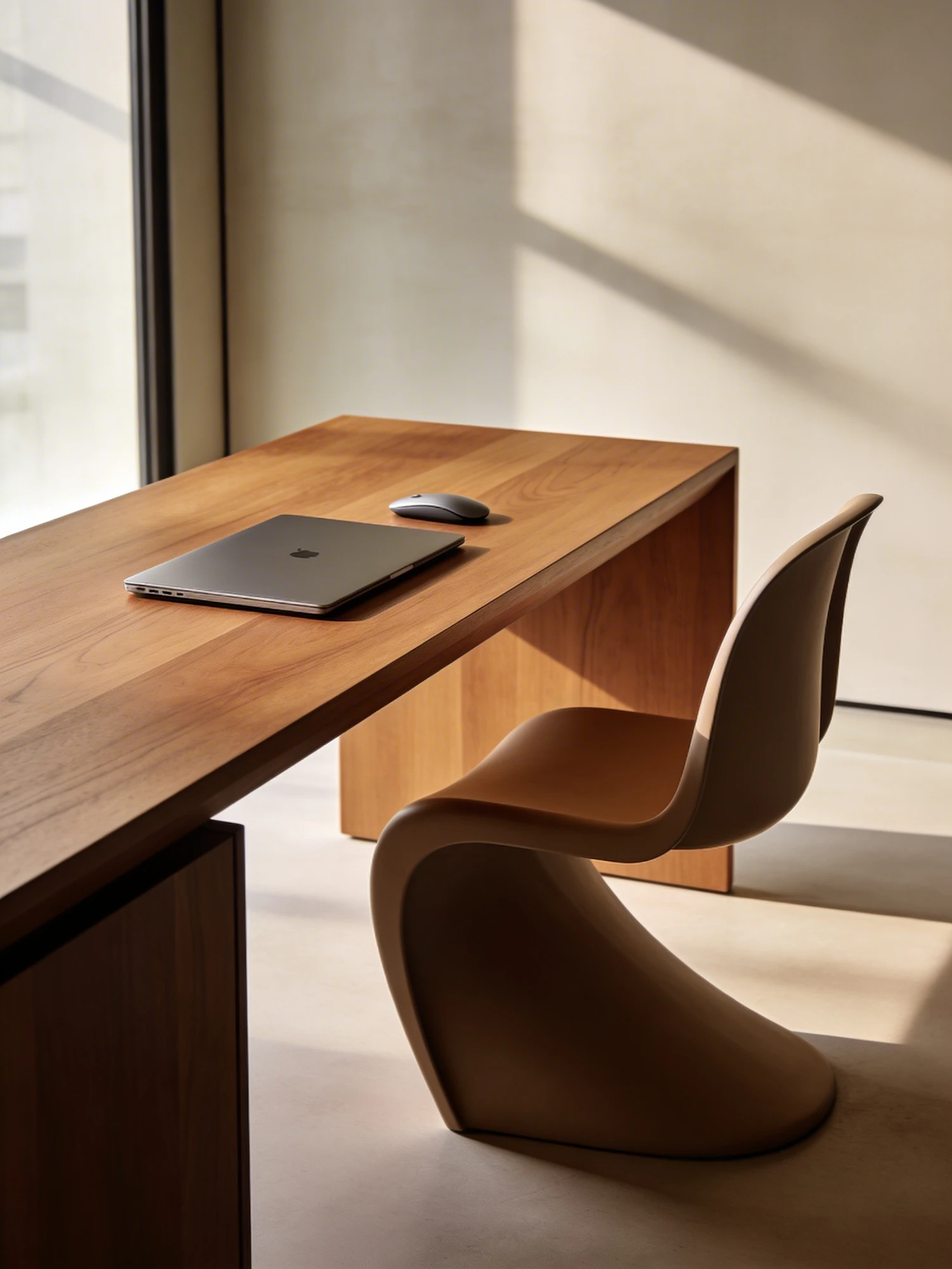 Minimalist workspace with a wooden desk, modern chair, and natural light, featuring a laptop and mouse for a clean, functional setup.