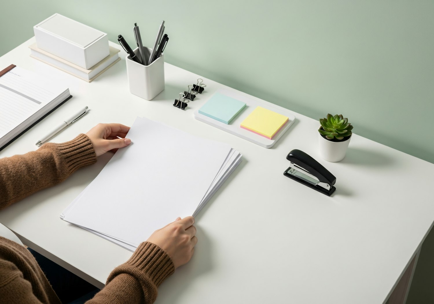 A clean and organized desk setup with office supplies, a succulent plant, and a person holding papers, set against a soft green wall.