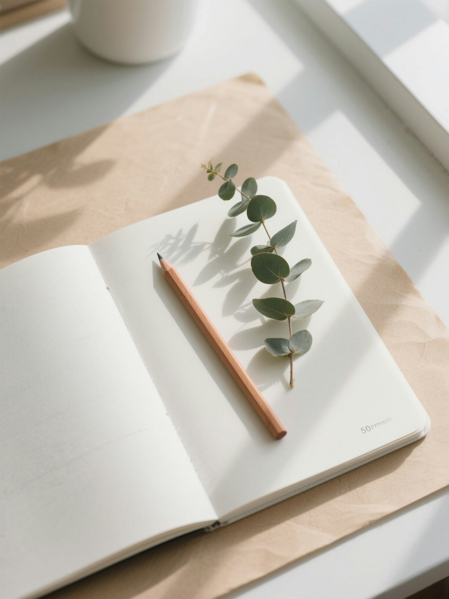 Minimalist workspace with an open notebook, wooden pencil, and eucalyptus sprig in soft natural light. Perfect for creative inspiration.
