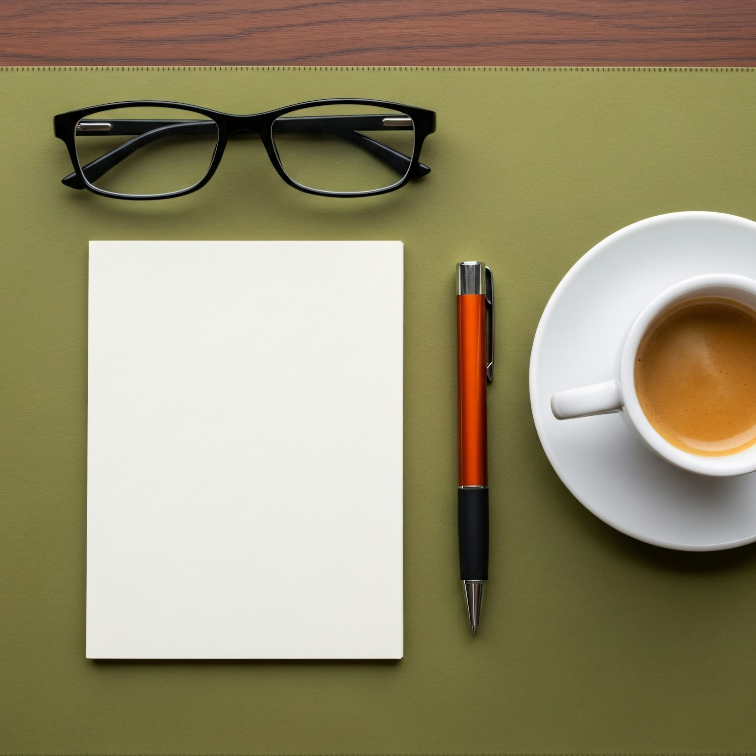Minimalist workspace setup with glasses, notepad, pen, and espresso on a green mat. Perfect for productivity and focus inspiration.