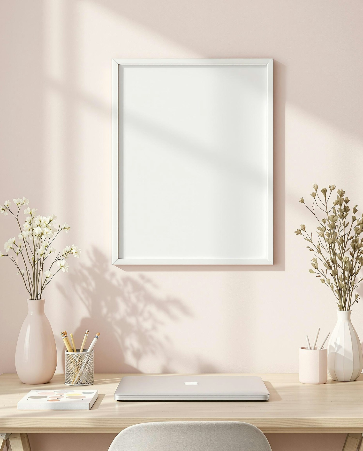 Calm workspace with a light wooden desk, a silver laptop, flower vases, and a blank white frame on a soft pink wall.