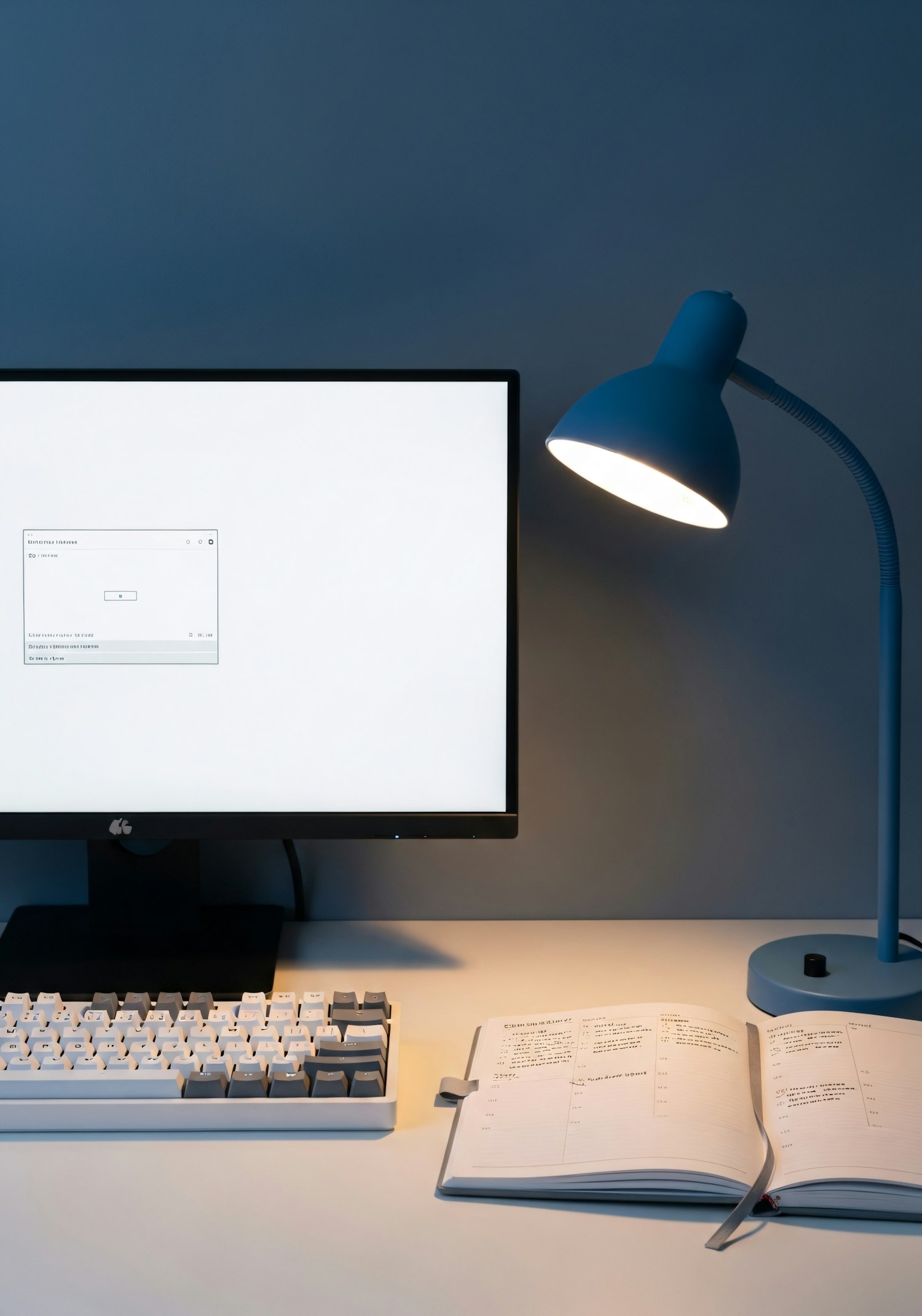 Minimalist workspace with a monitor, keyboard, notebook, and a blue desk lamp on a clean desk.
