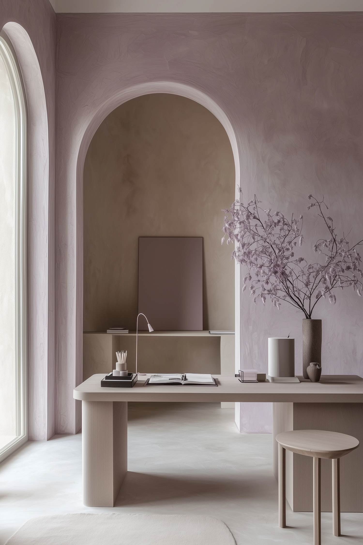 Minimalist workspace with soft lavender tones, natural light, and elegant decor, featuring a sleek desk and delicate floral accents.