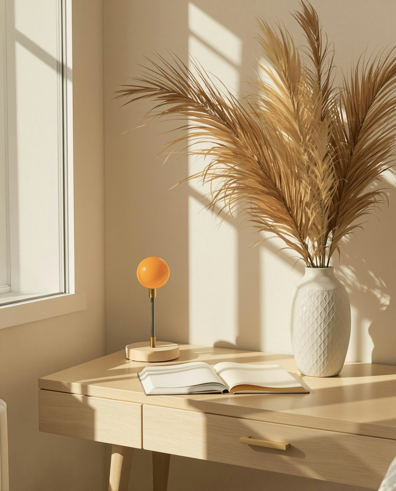 Minimalist desk setup with pampas grass in a white vase, an orange lamp, and an open book, bathed in warm natural light.