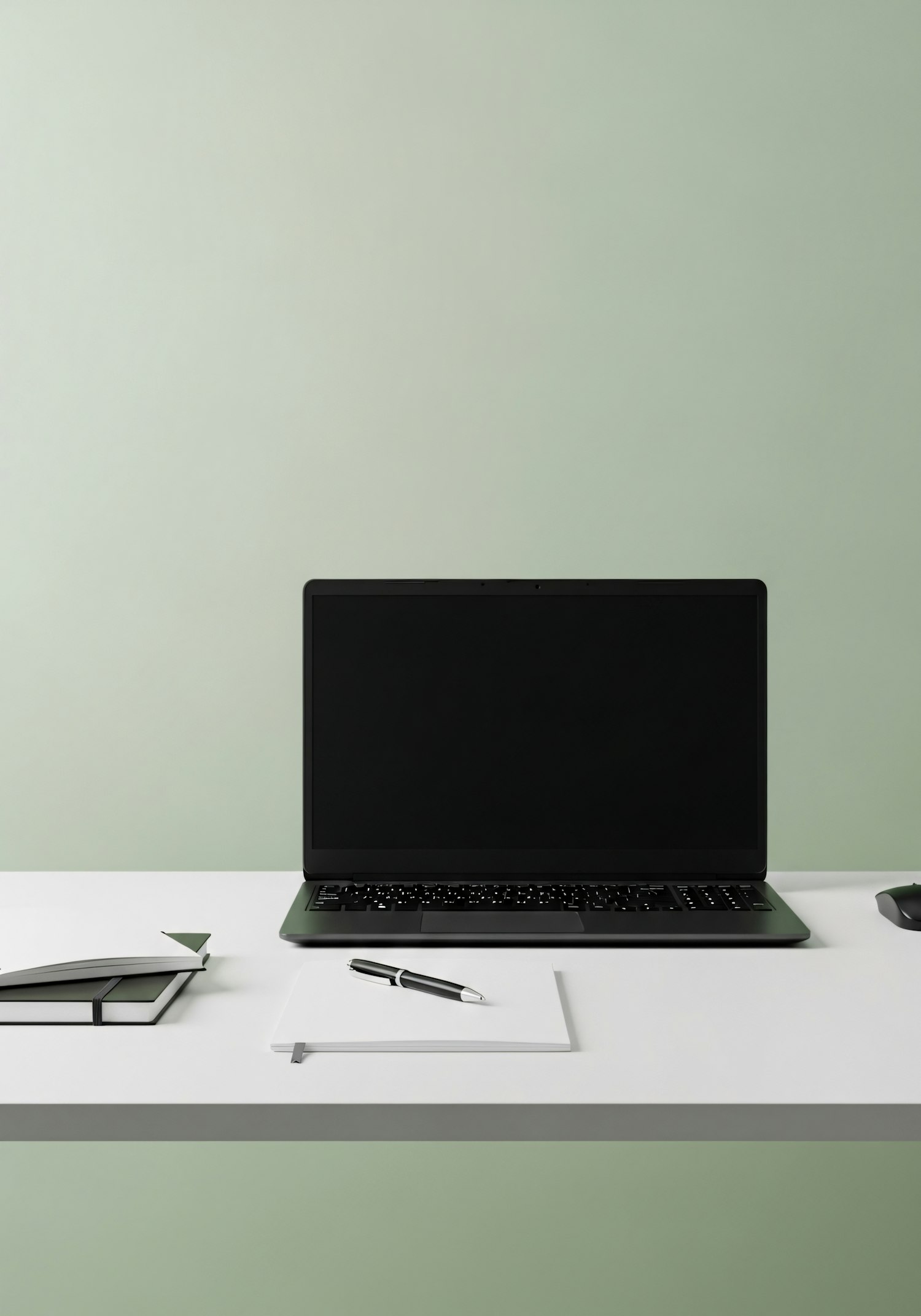 Minimalist workspace with a black laptop, notebooks, and a pen on a white desk against a pastel green background.