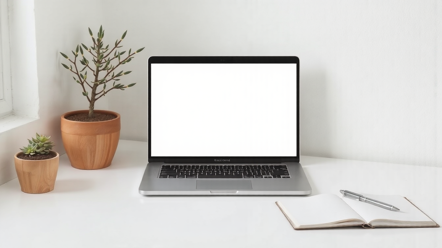 Minimalist workspace with a laptop, potted plants, an open notebook, and a pen on a clean white desk.