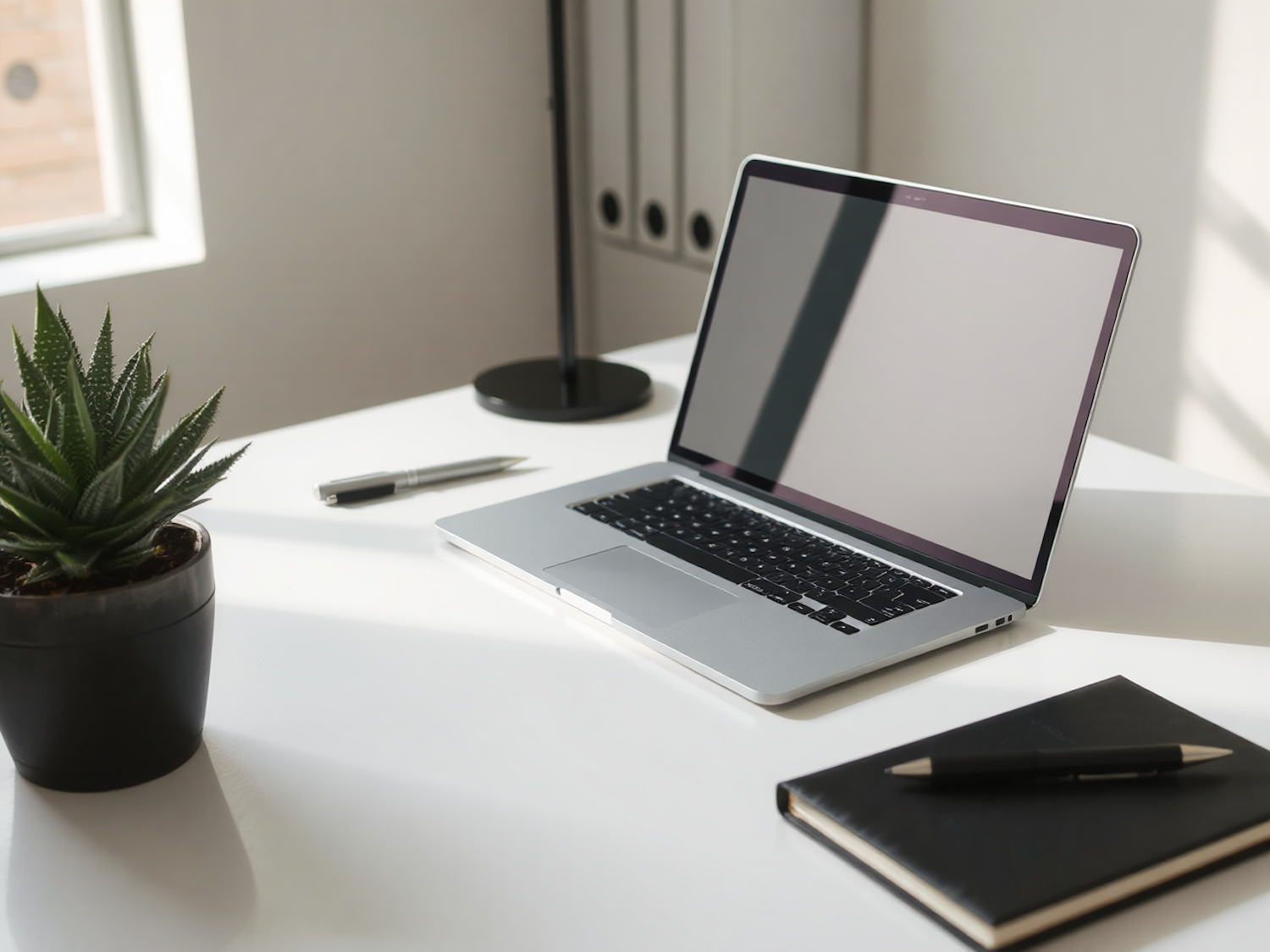 Minimalist workspace with a laptop, succulent, and notebook on a white desk, bathed in natural light for a serene work environment.
