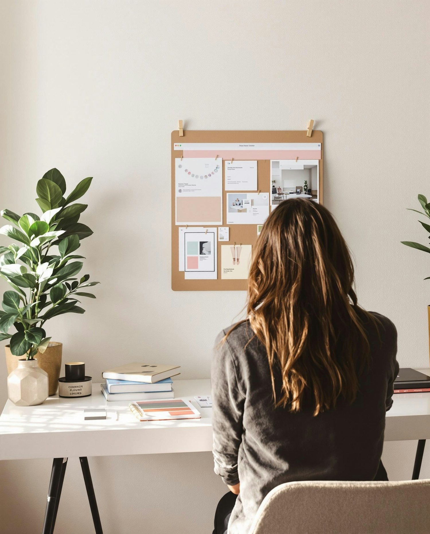 A peaceful creative workspace with a woman seen from behind, sitting at a minimalist desk. She is focused on a moodboard pinned on the wall. The room is softly lit by natural daylight. On the desk: color swatches, notebooks, and a computer screen with a blurred design interface. The atmosphere is warm, quiet, and thoughtful. The woman’s face is not visible, and the image feels candid and authentic. Style: candid lifestyle photography, realistic lighting, soft tones, modern design.
