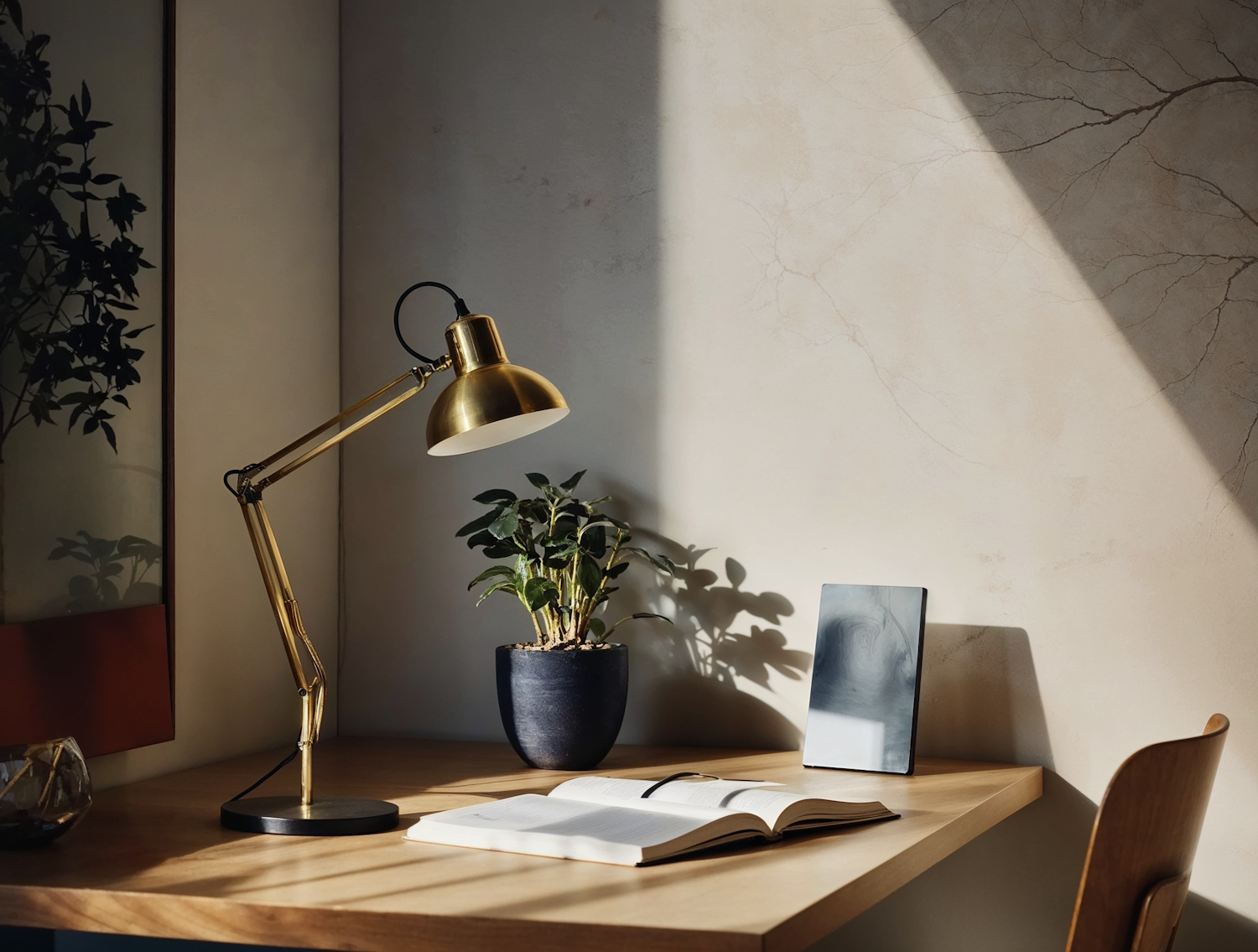 A cozy workspace with a brass lamp, potted plant, open book, and tablet on a wooden desk, illuminated by warm natural light.
