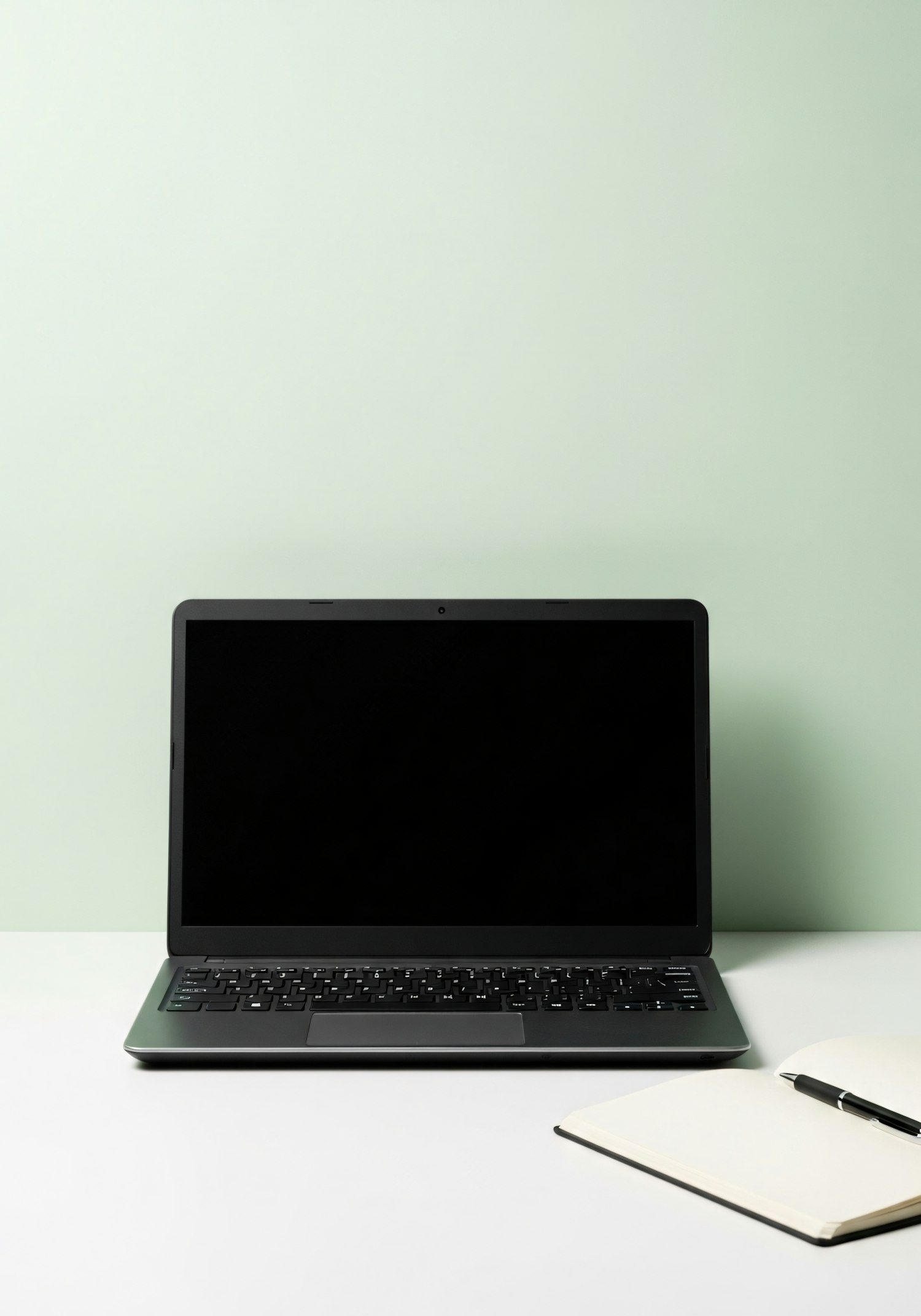 Minimalist workspace with a black laptop, open notebook, and pen on a white desk against a light green background.