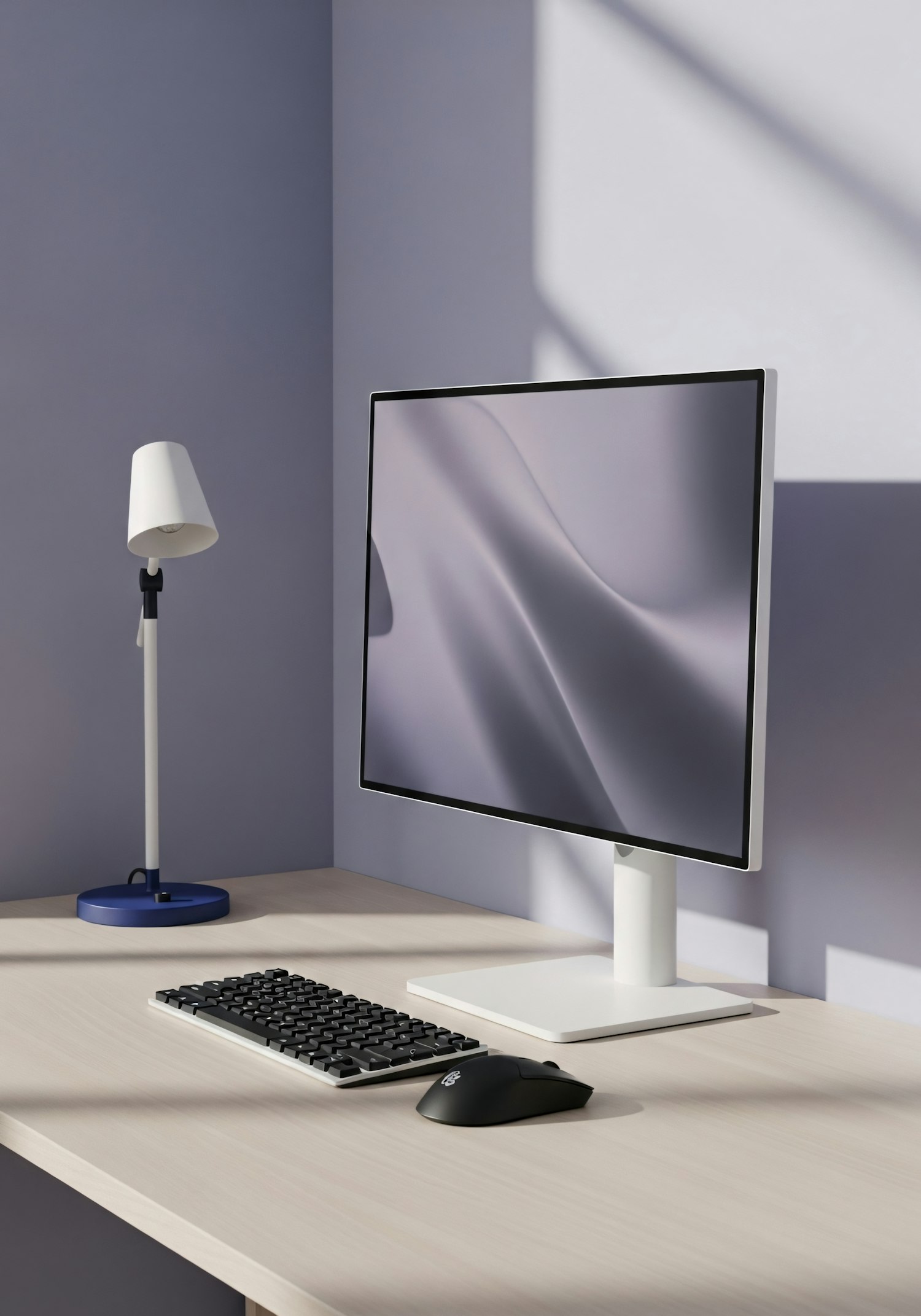 Minimalist workspace with a sleek monitor, keyboard, mouse, and a modern desk lamp on a light wooden desk.