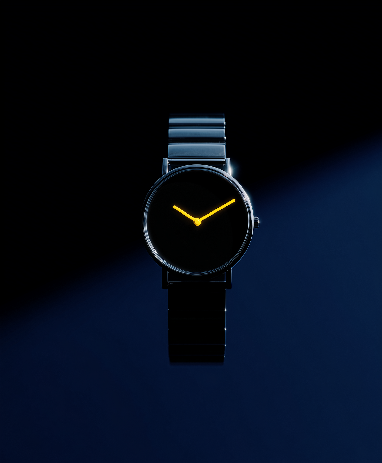 Minimalist black wristwatch with bright yellow hands, set against a dark background for a sleek and modern aesthetic.