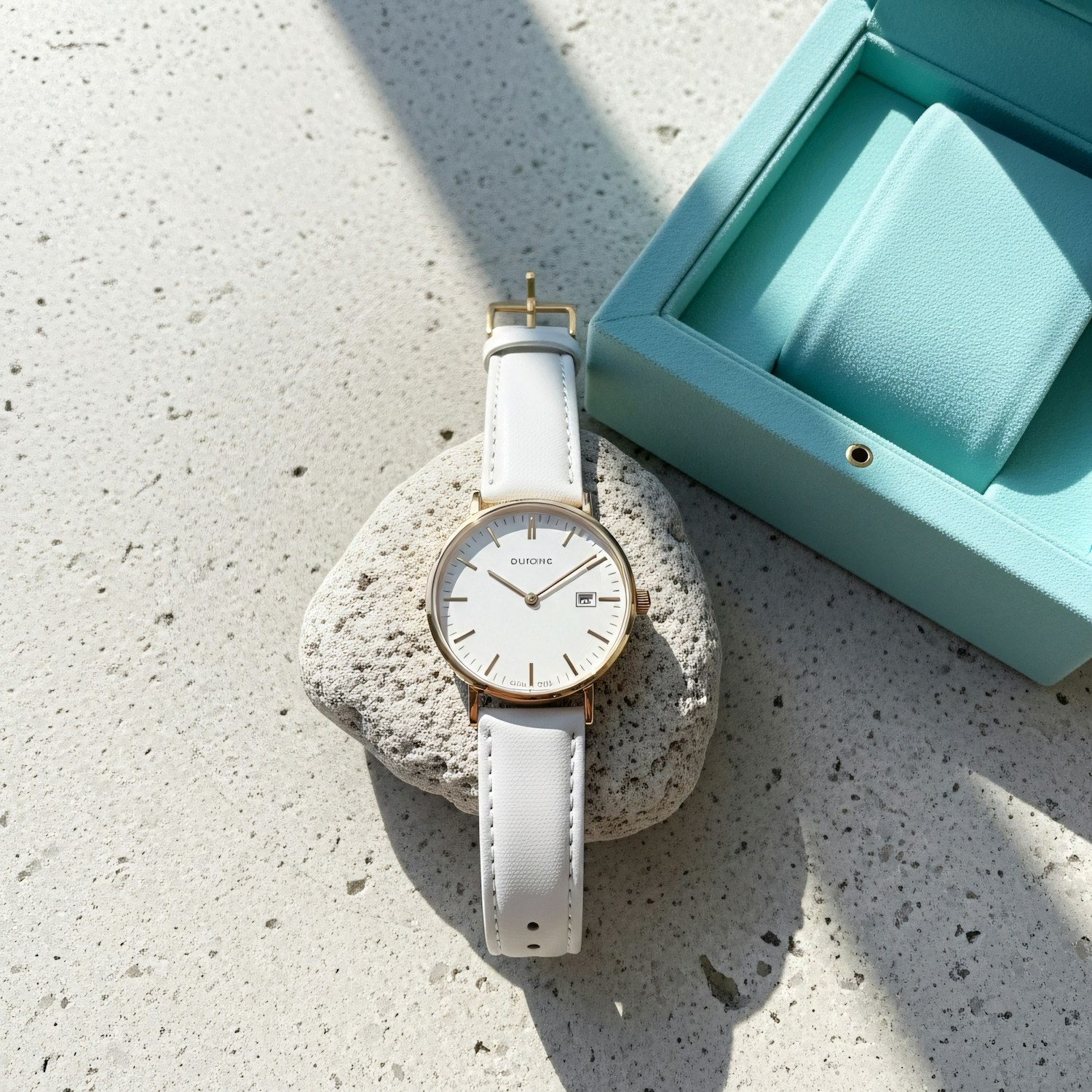 Minimalist white and gold wristwatch with a leather strap, displayed on a stone next to a light blue box, in natural sunlight.