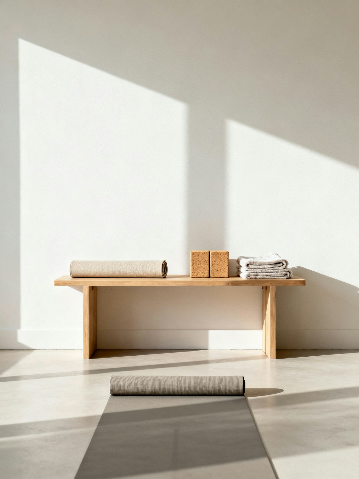 Bright yoga space featuring a simple wooden storage bench against an off-white wall, bench top holding a rolled neutral mat, two cork blocks, and a folded towel; on the floor in front, an unrolled mat ready for practice; daylight from camera-left adds gentle depth to the bench and wall, composition symmetrical and calming. 35 mm, f/4, ISO 100, 1/160 s; keep tones soft. Negative: branded sports items, vivid colors, mixed lighting, wall art.