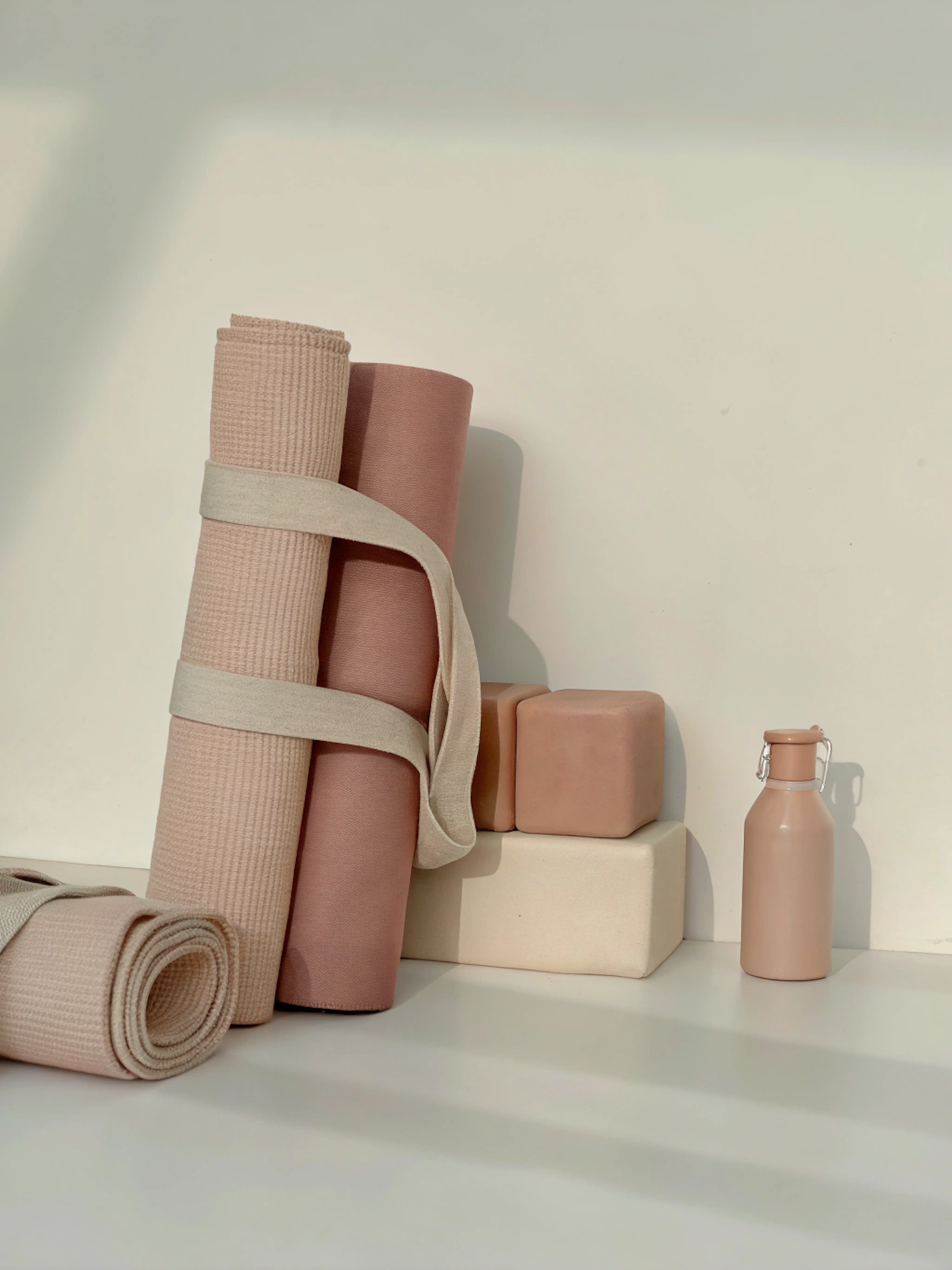 Minimalist yoga setup with beige and blush mats, matching blocks, and a sleek water bottle in soft natural light.
