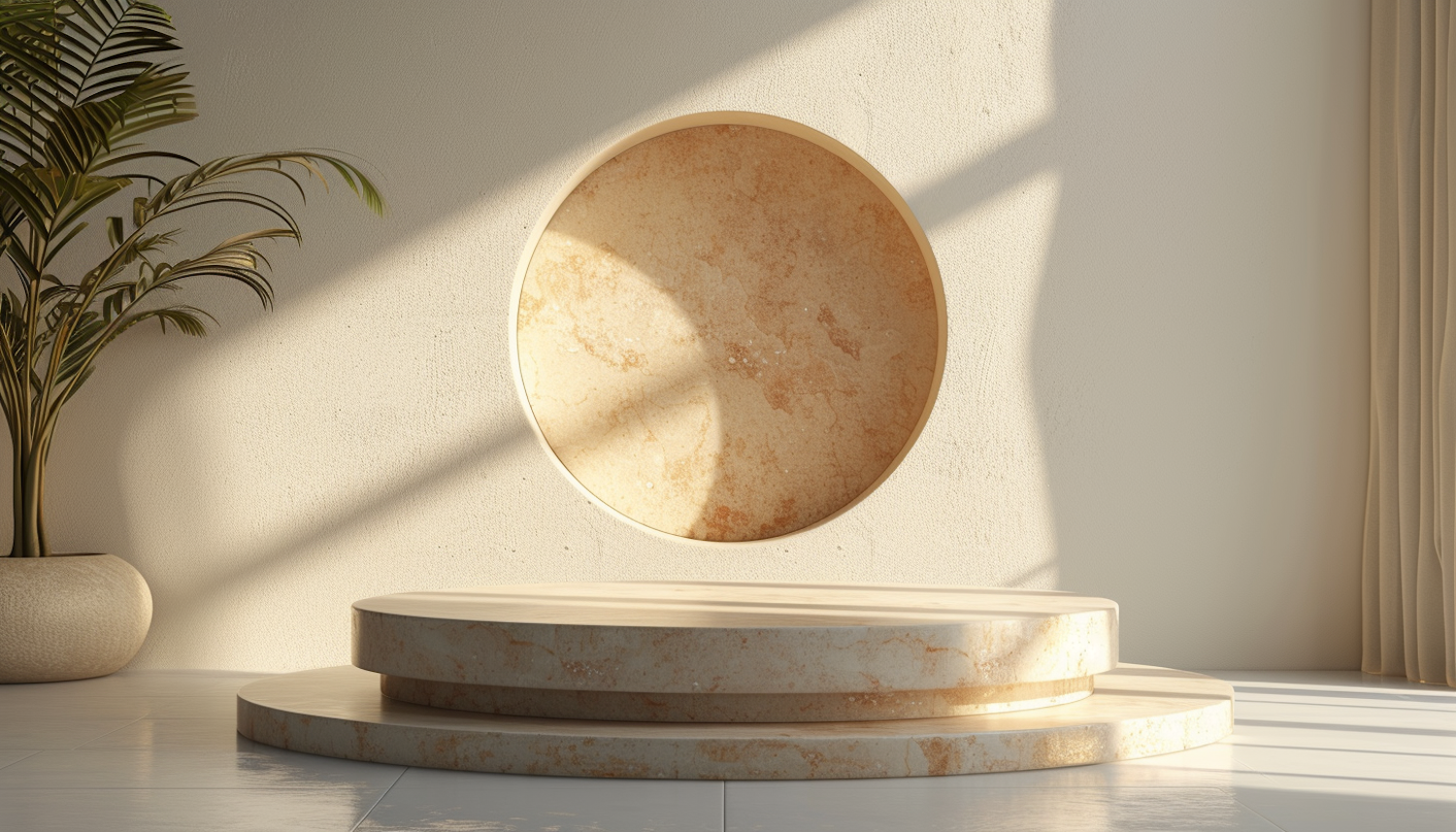 Minimalist interior with marble platform, circular wall feature, and potted plant bathed in soft sunlight. Neutral tones and serene design.