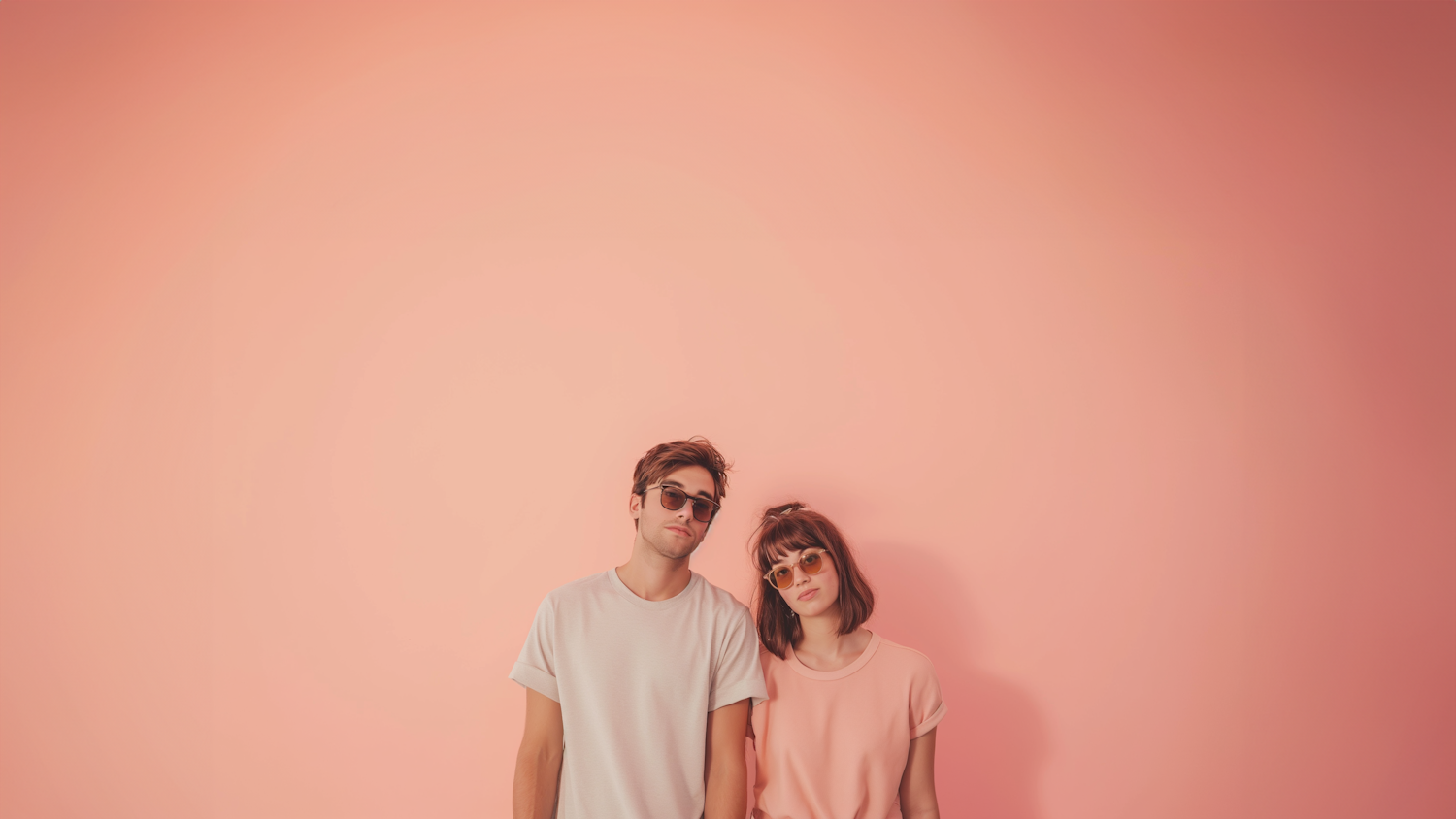 Stylish couple in sunglasses against a soft pink background, exuding a relaxed and minimalist vibe.