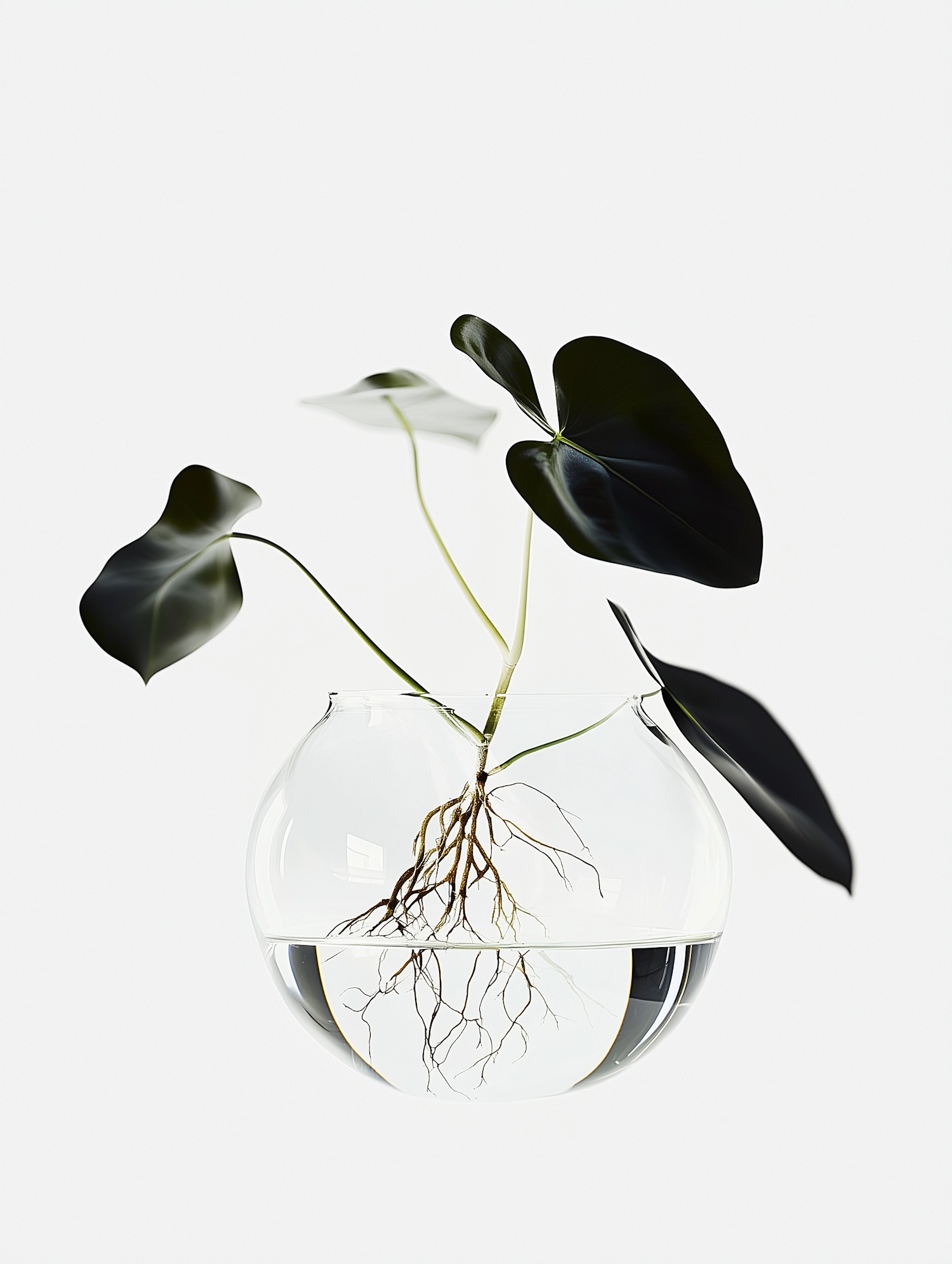 Minimalist image of a plant with dark green leaves in a clear glass bowl, showcasing intricate roots in water.