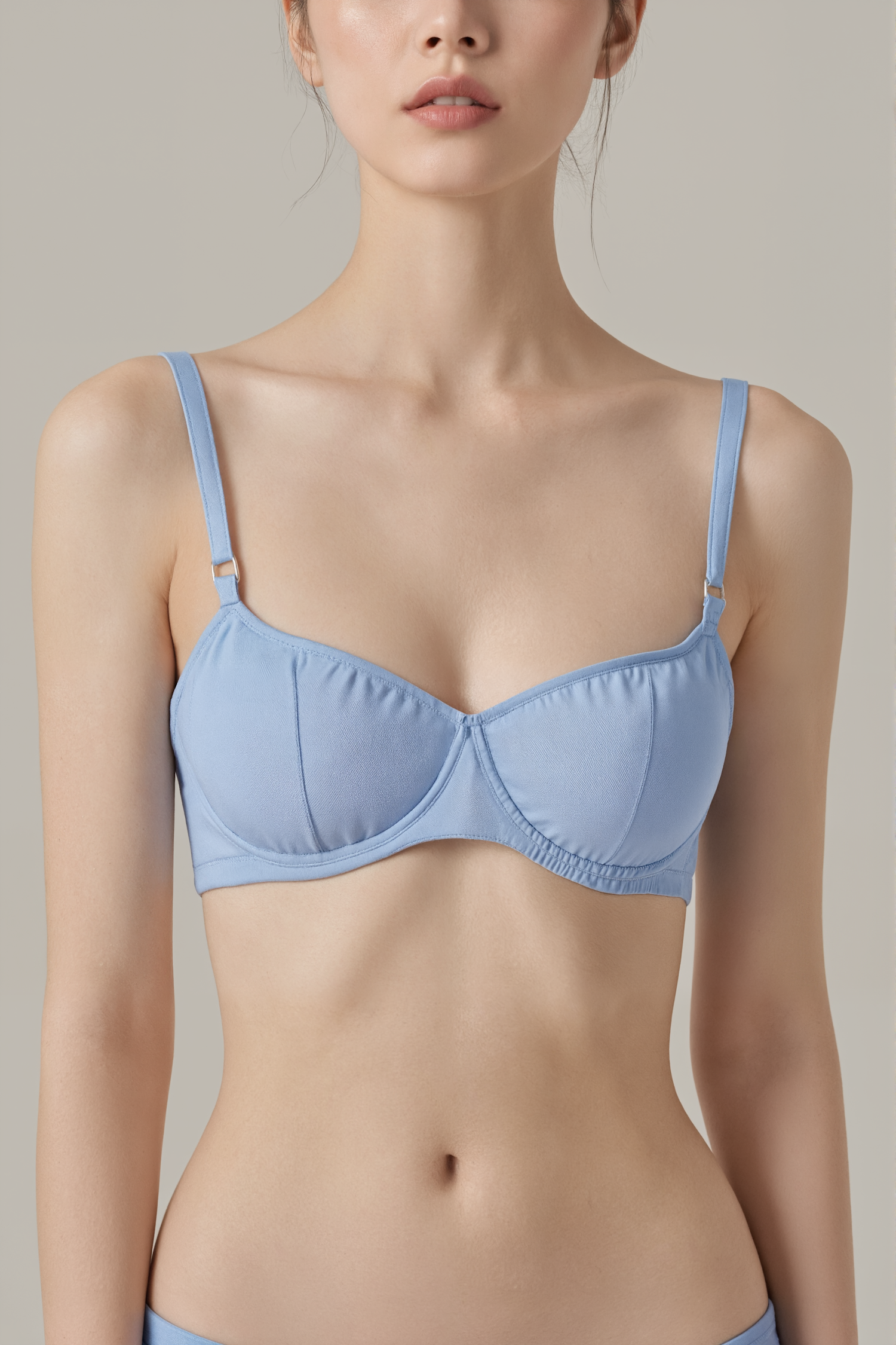 Woman in a light blue bra with a neutral expression, showcasing the fit and style against a plain background.