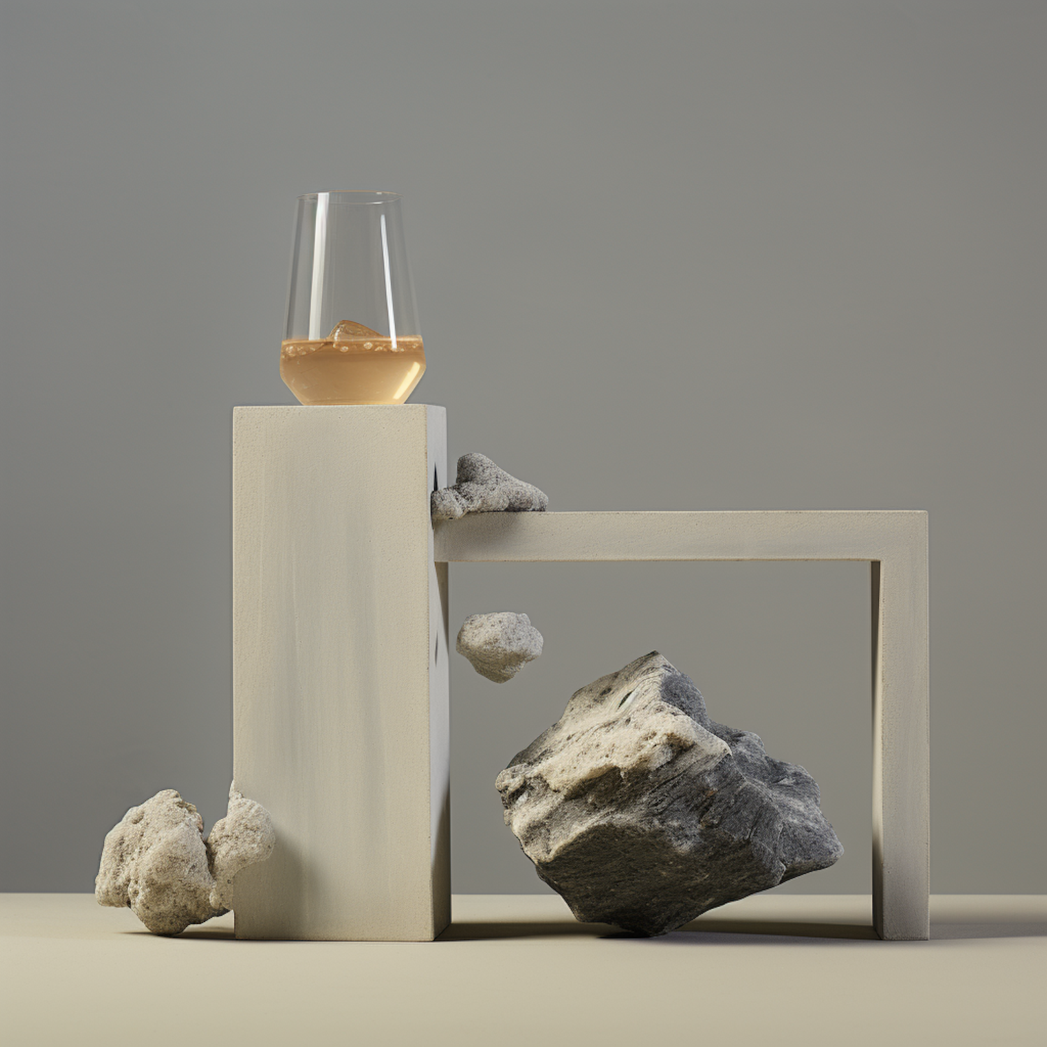 Minimalist scene with a glass of amber liquid on a geometric structure, surrounded by textured gray rocks.