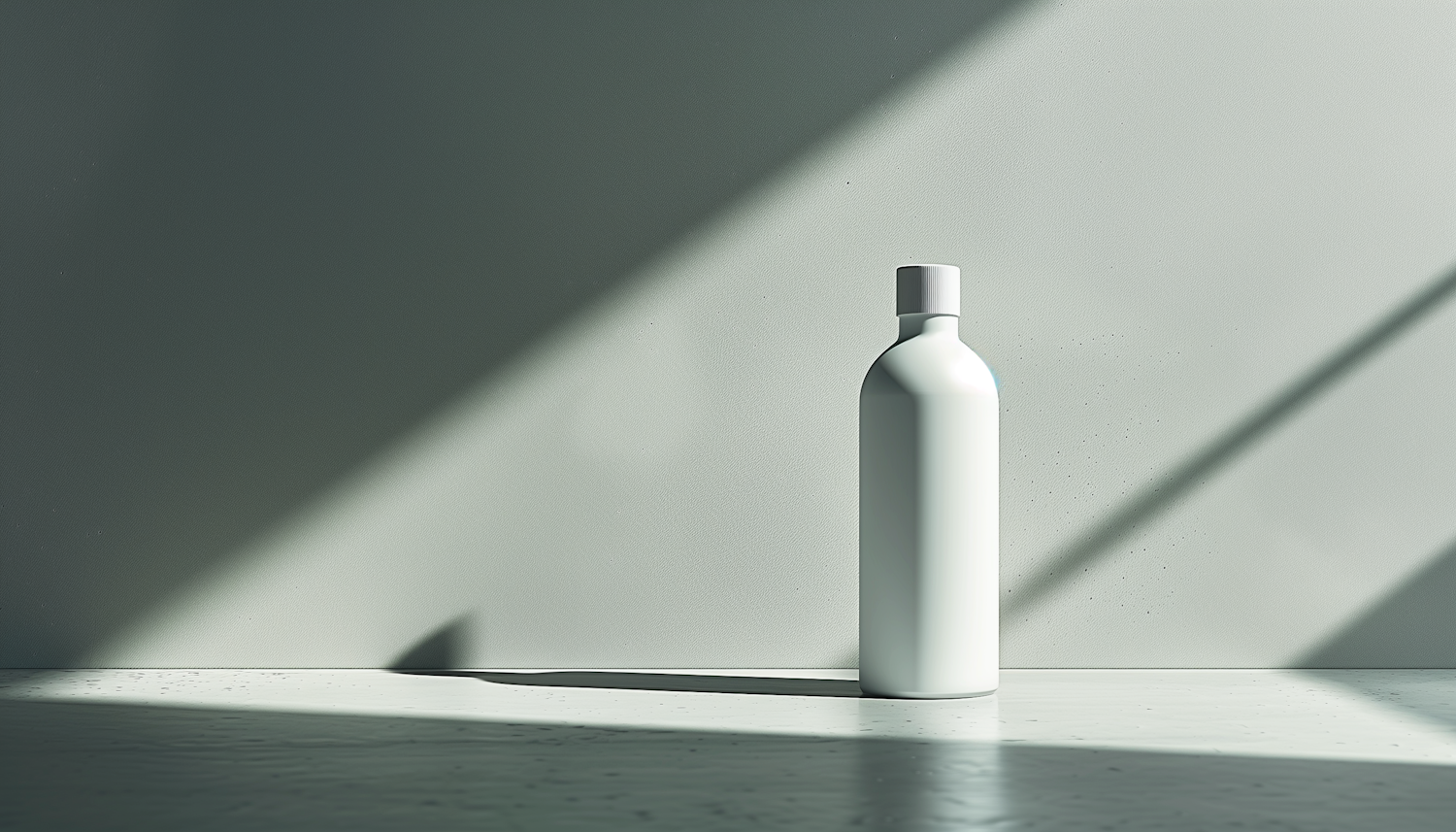 Minimalist white bottle casting a shadow on a light surface with diagonal sunlight, creating a serene and elegant scene.