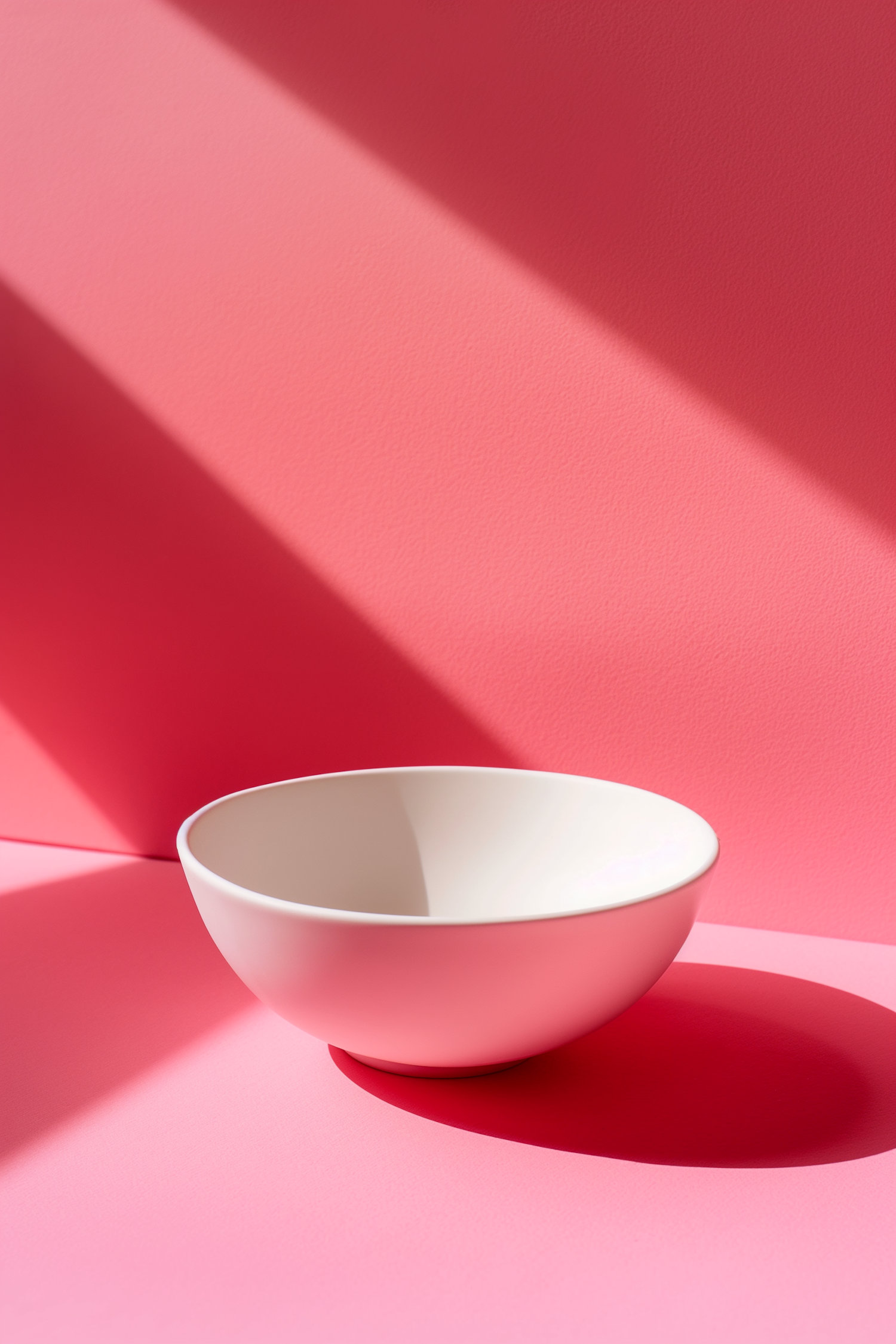 Minimalist white ceramic bowl on a vibrant pink background with soft shadows and diagonal lighting.