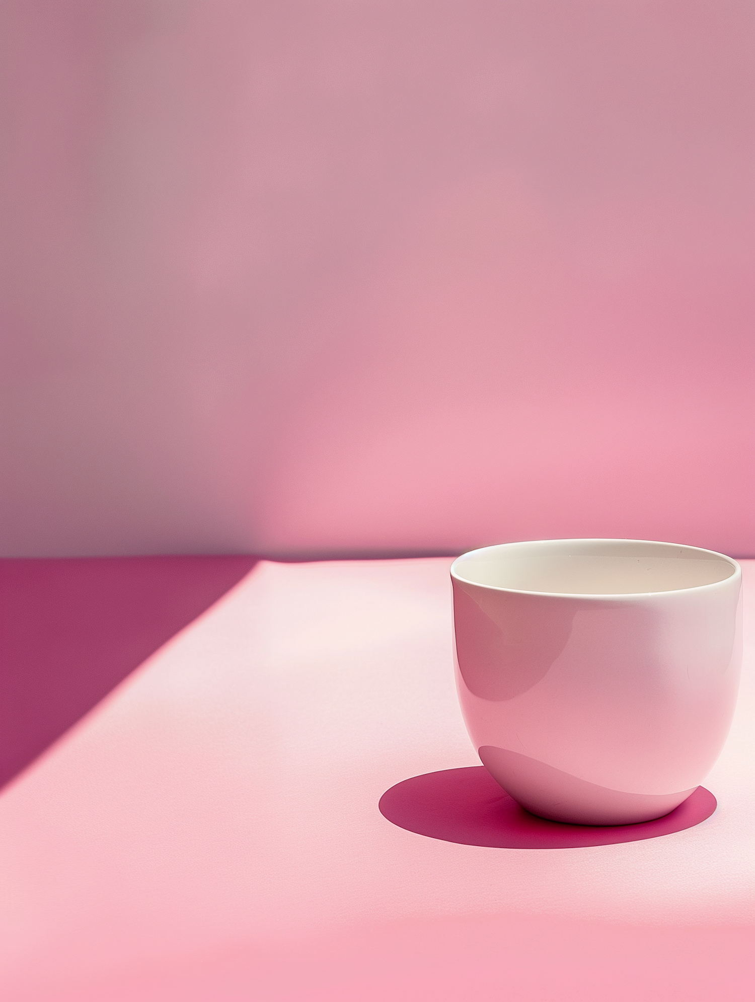 Minimalist white cup on a pink surface with soft shadows and gradient background, creating a calm and elegant composition.