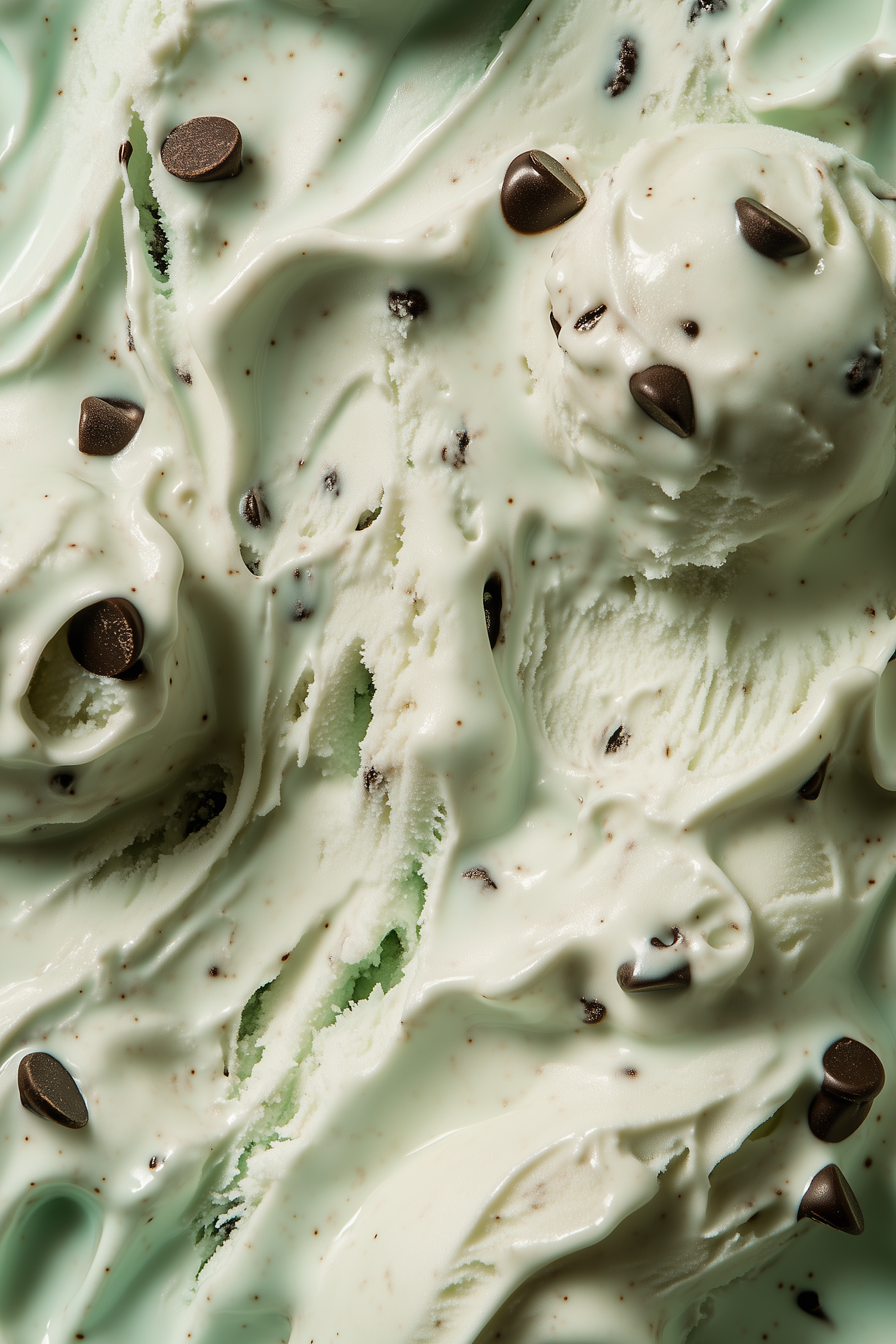 Close-up of mint chocolate chip ice cream with creamy texture, pale green color, and glossy chocolate chips for a delicious treat.
