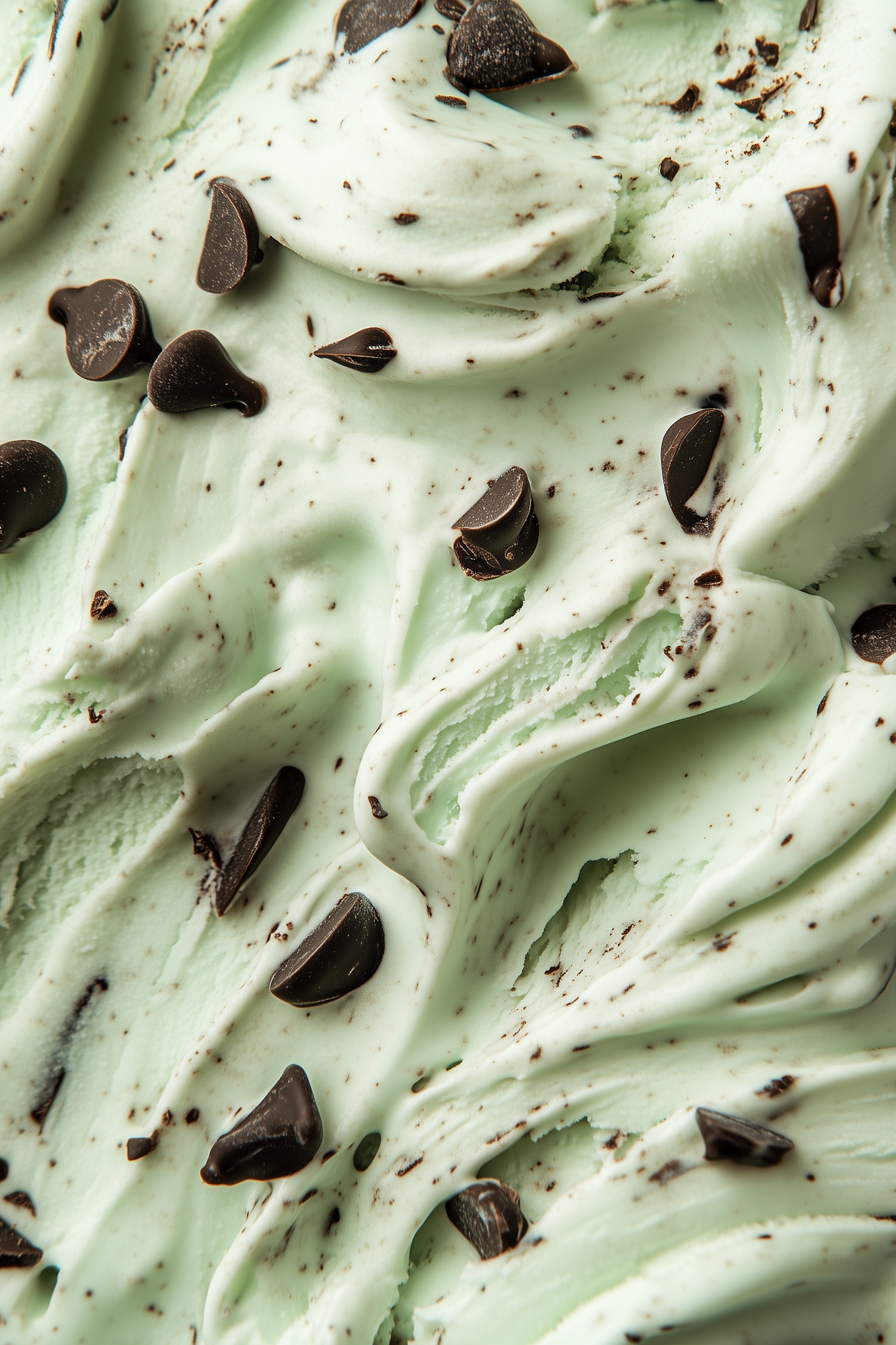 Close-up of creamy mint chocolate chip ice cream with pale green swirls, dark chocolate chips, and flecks of chocolate for a delicious treat.