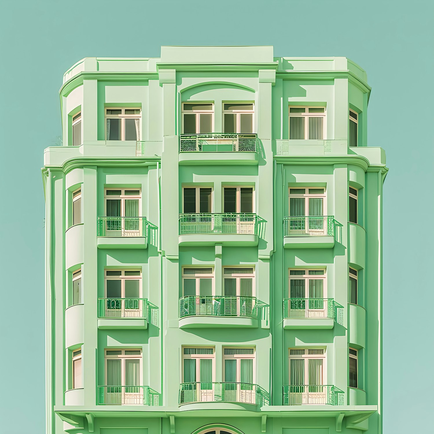 A pastel green building with symmetrical windows and balconies against a matching green sky, creating a surreal and harmonious visual effect.