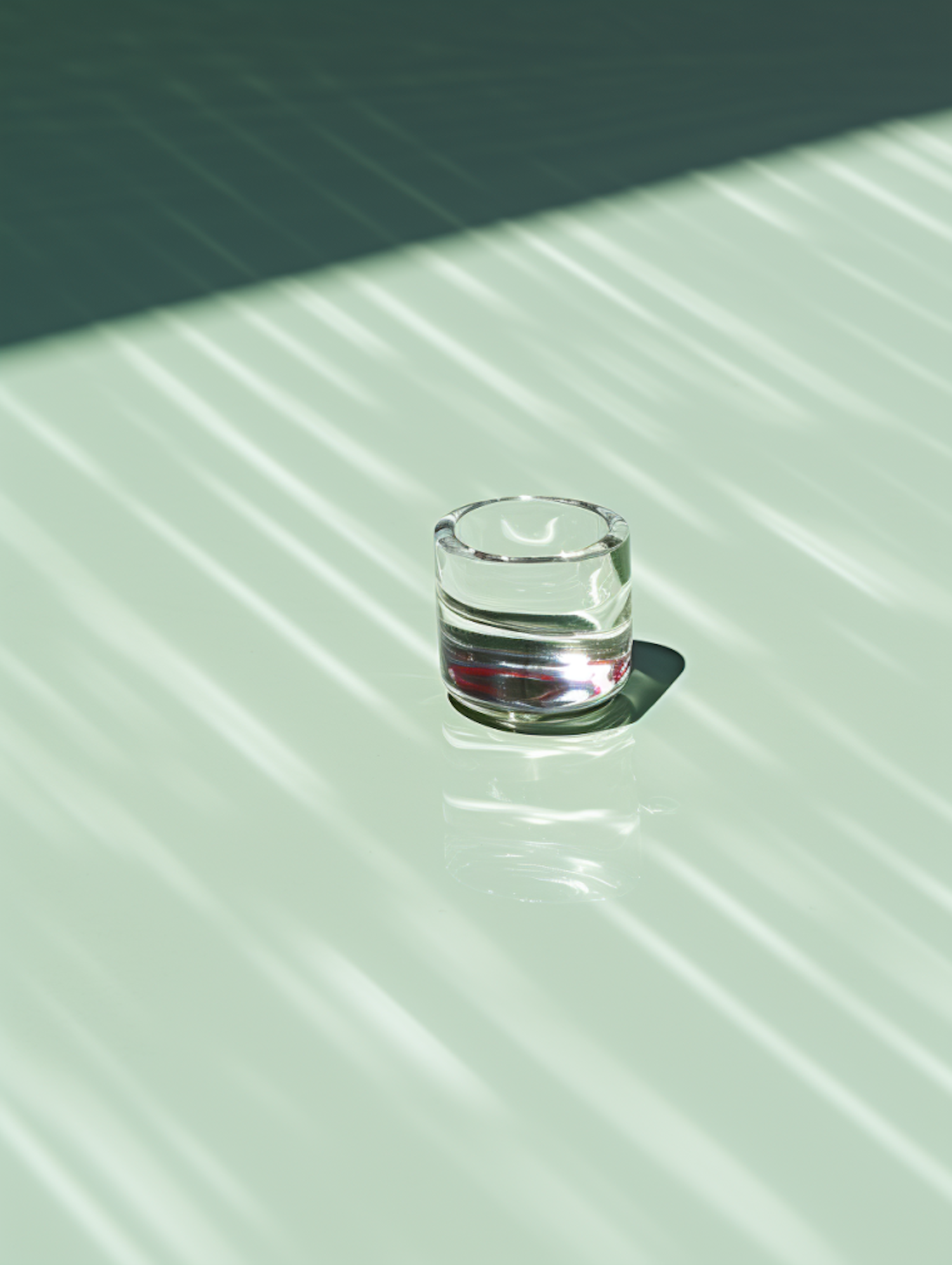 Minimalist glass of water on a light green surface with dynamic light streaks and shadows, creating a serene and modern aesthetic.