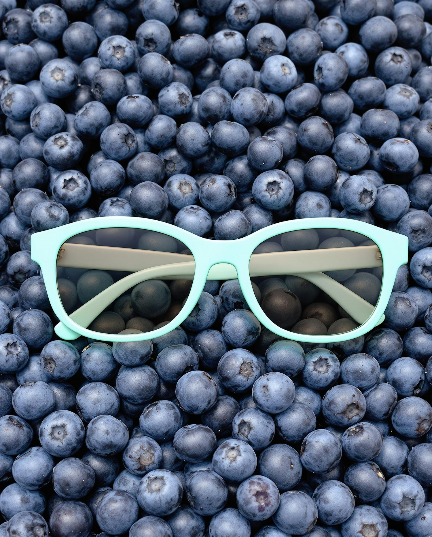 Elongated oval sunglasses in icy mint color, arranged on a tightly packed layer of blueberries. Vivid contrast of color, sharp natural light, full fruit texture
