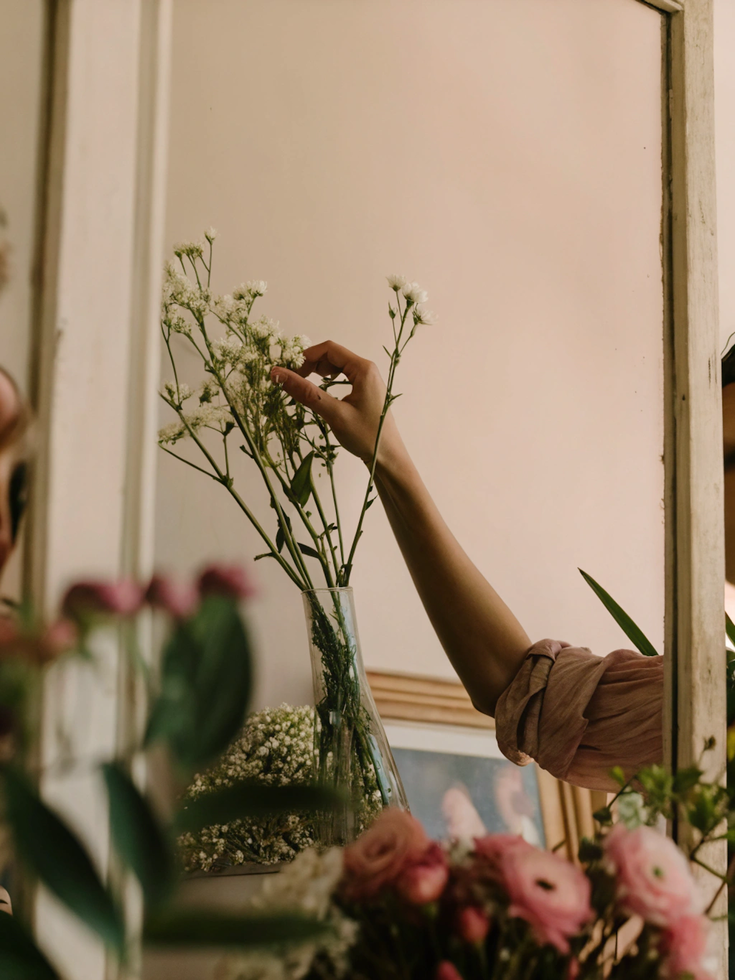 A serene mirror reflection of a hand arranging baby's breath in a vase, surrounded by blurred pink roses and a cozy, muted background.