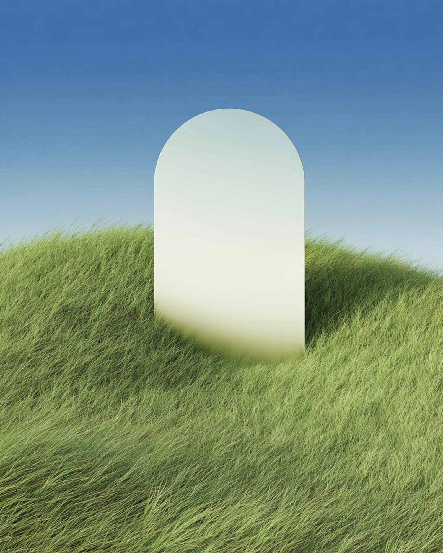 A minimalist scene with a mirror in a grassy field under a clear blue sky, blending nature and art in a tranquil setting.