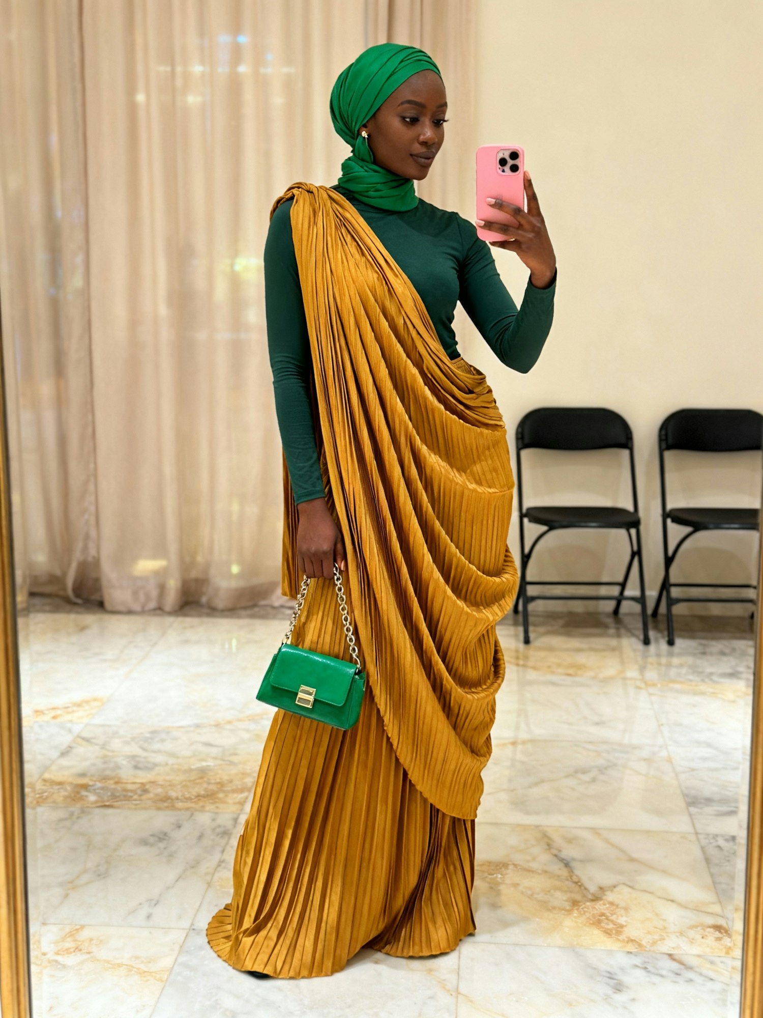A fashion-forward mirror selfie of a Black woman standing indoors on a marble floor, wearing a long, pleated mustard-yellow dress with draped detailing. Underneath, she wears a dark green long-sleeved top and a matching green headscarf that wraps around her head and neck. She holds a pink smartphone in one hand and carries a small green handbag with a chain strap in the other. The background includes a curtain and two black folding chairs, adding casual contrast to the elegant outfit. The lighting is soft and ambient, highlighting the textures of the pleats and the color coordination. The mood is stylish, composed, and expressive—blending modest layering with bold color play in a contemporary editorial setting.