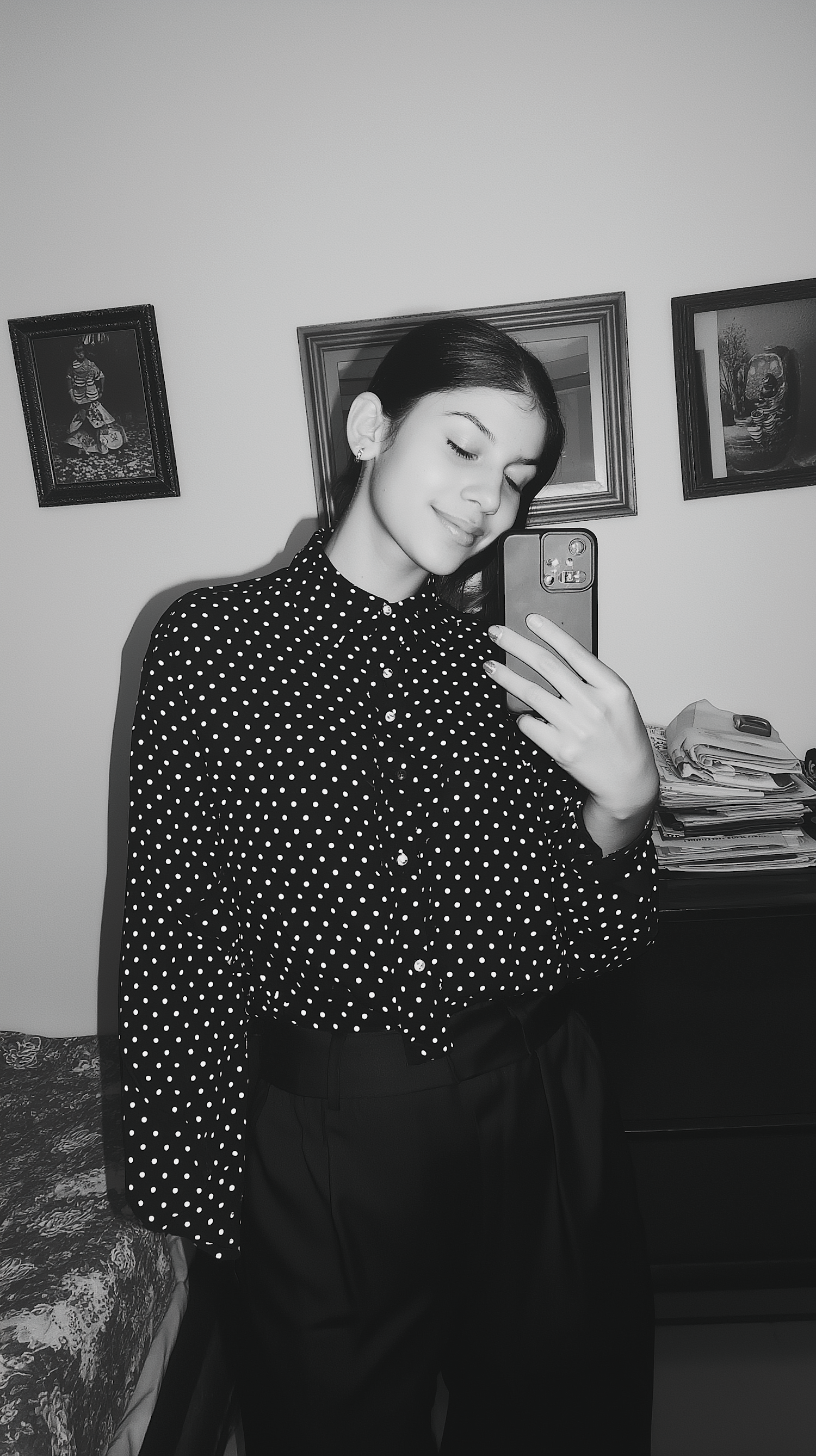 Black-and-white selfie of a person in a polka-dot shirt, smiling softly, with framed pictures and a cozy room in the background.