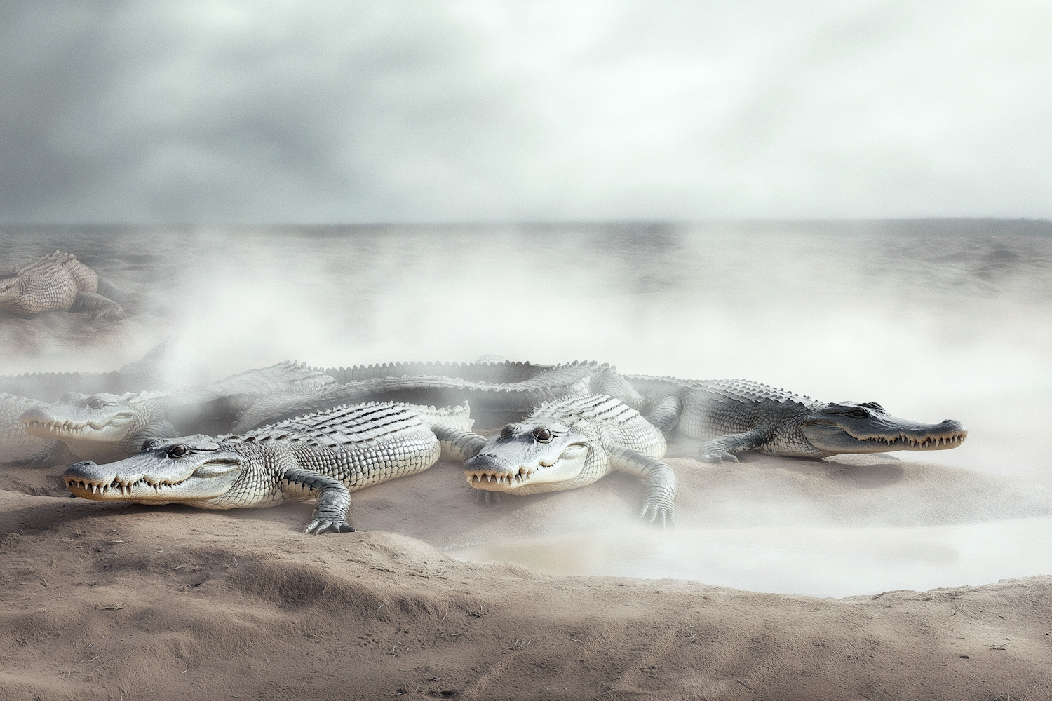 A misty riverbank with alligators resting on the sand, their scaly textures and sharp features creating a mysterious, primal vibe.