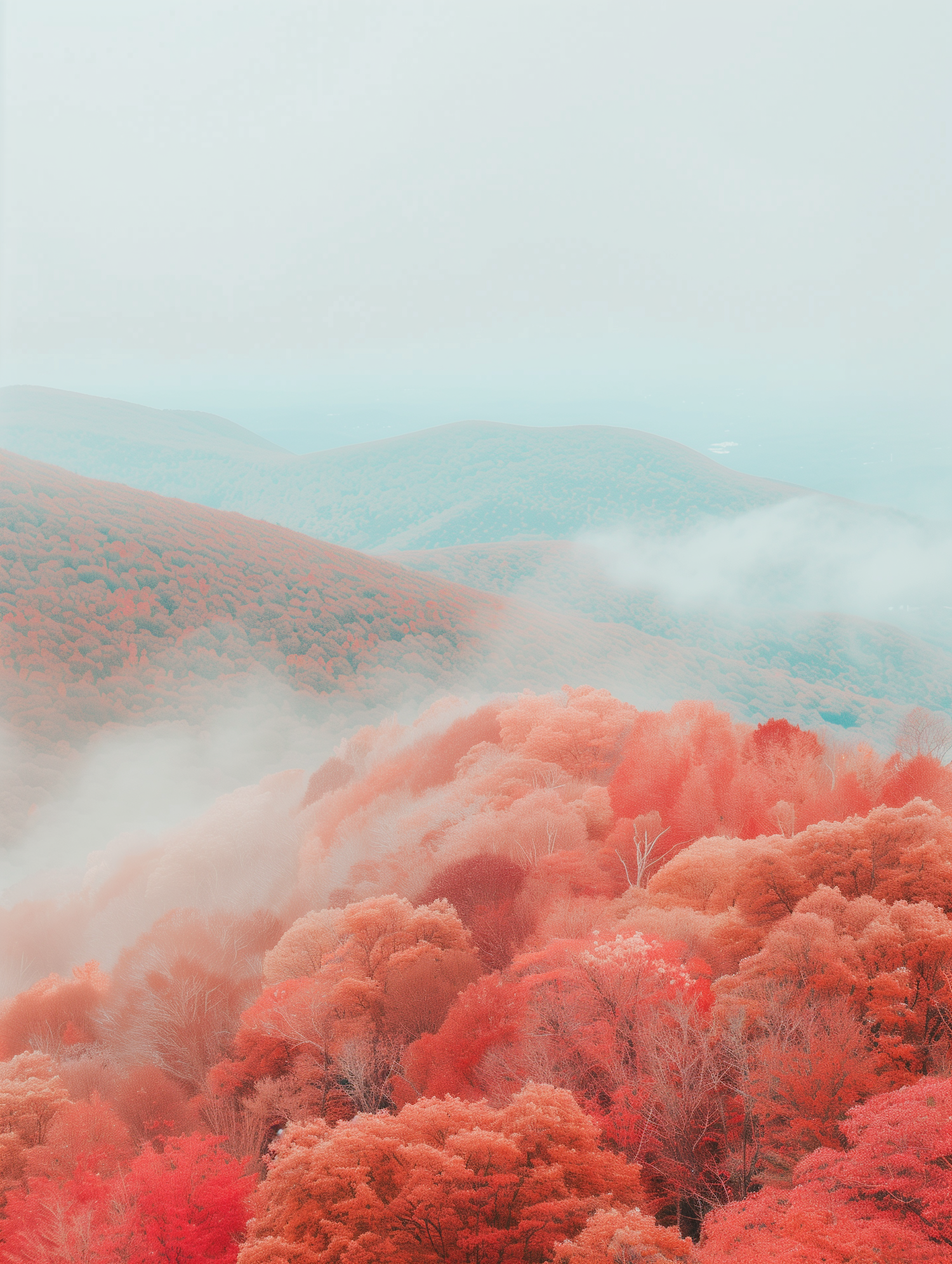 Dreamy landscape of misty hills with vibrant red and orange foliage, creating a surreal and tranquil atmosphere.