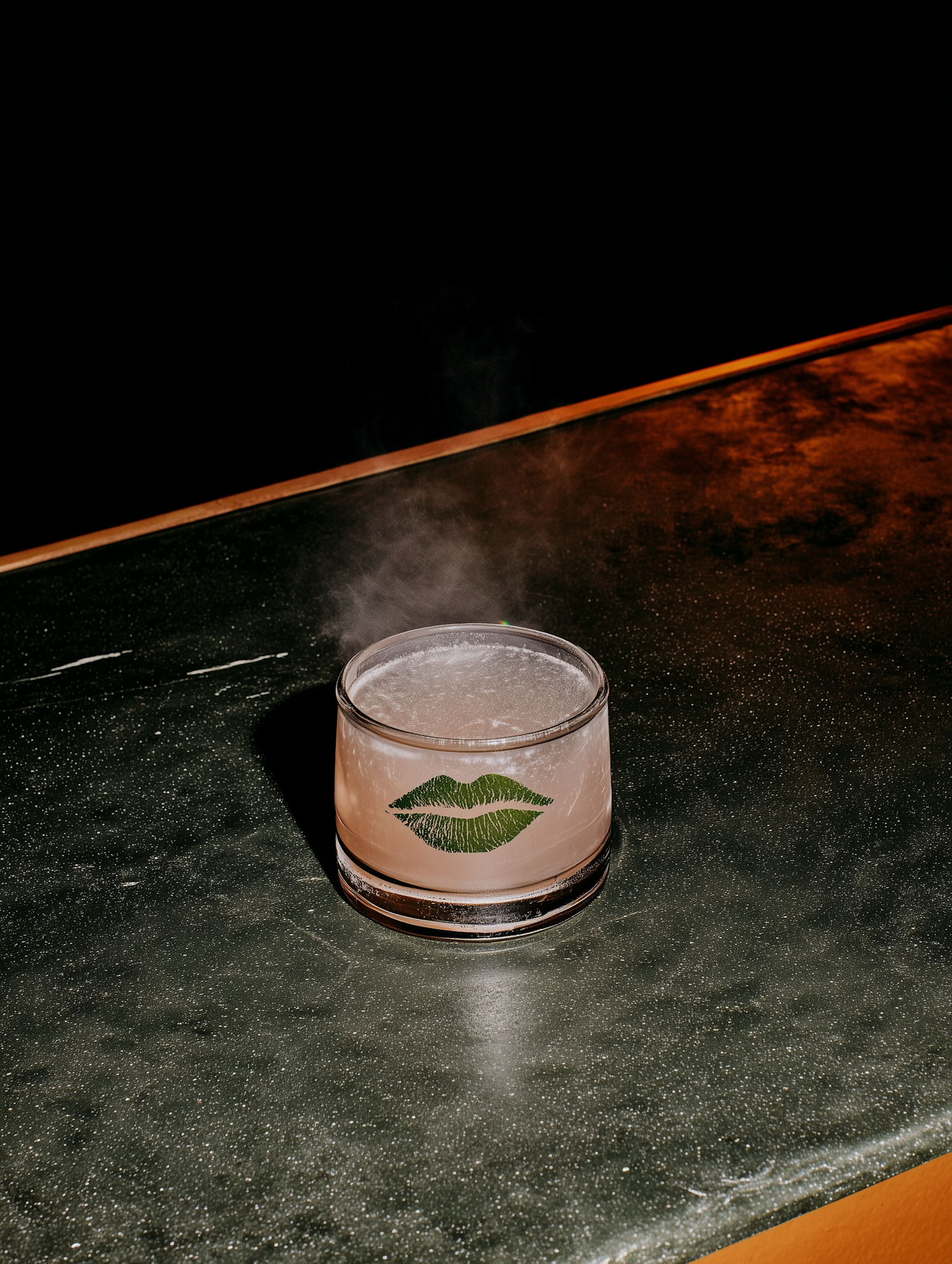 A stylish glass with a green lips design holds a misty beverage on a dark green surface, illuminated by warm lighting.